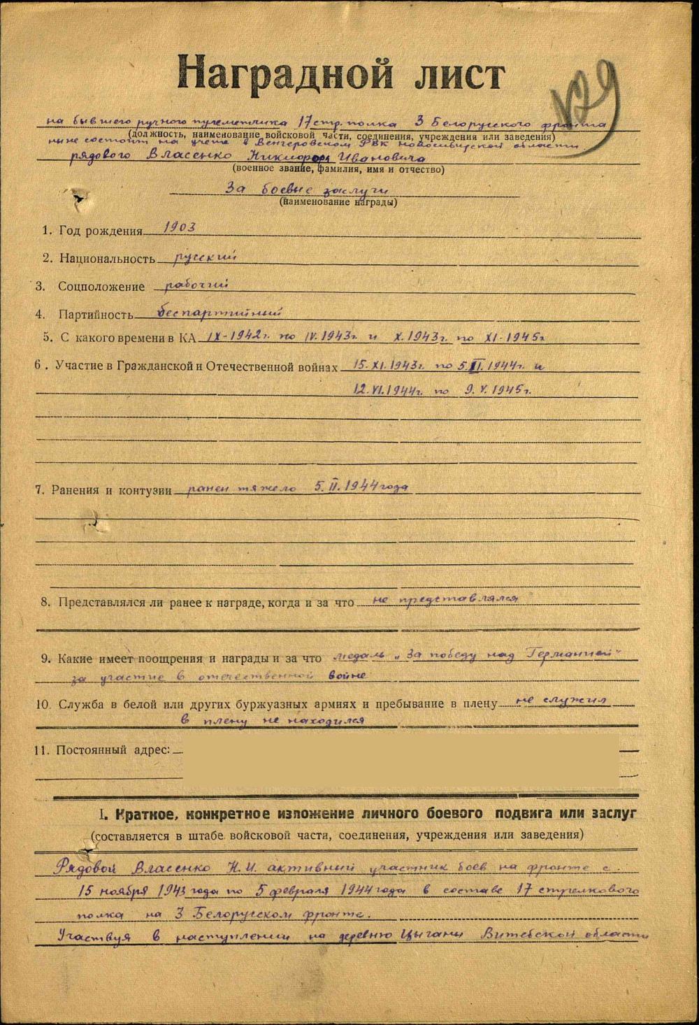 Власенко Никифор Иванович Медаль «За боевые заслуги» Наградной документ Дата рождения: ..1903 Дата поступления на службу: __.10.1943 Воинское звание: рядовой Воинская часть: 17 сп 3 БелФ Даты подвига: 05.02.1944 Наименование награды: Медаль «За боевые заслуги» Информация об архиве - Архив: ЦАМО Фонд ист. информации: 33 Опись ист. информации: 744808 Дело ист. информации: 1352; 25