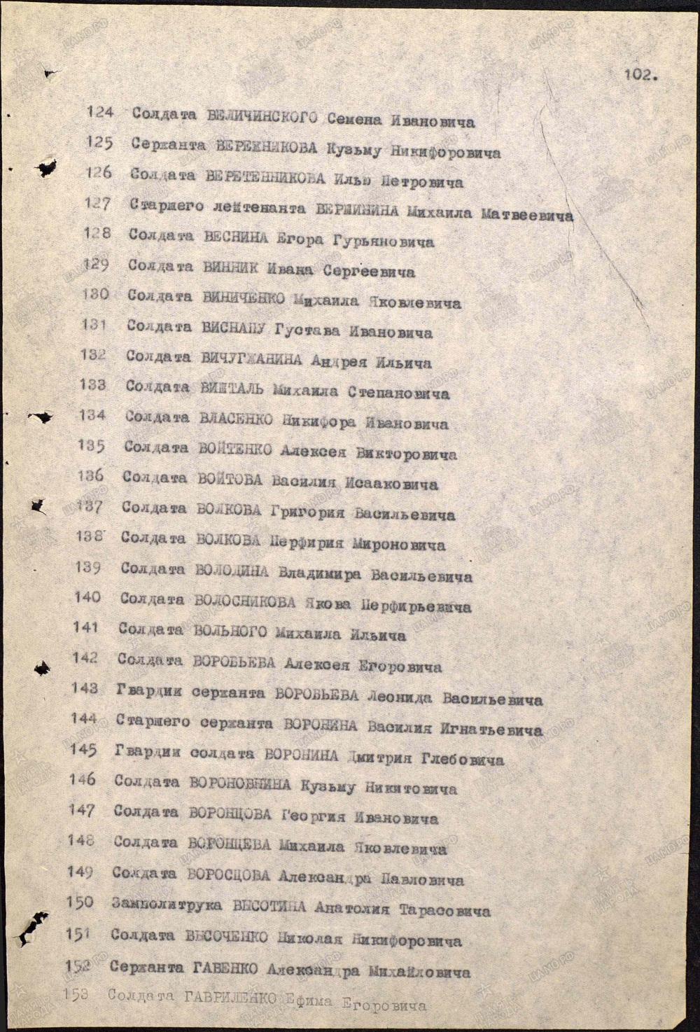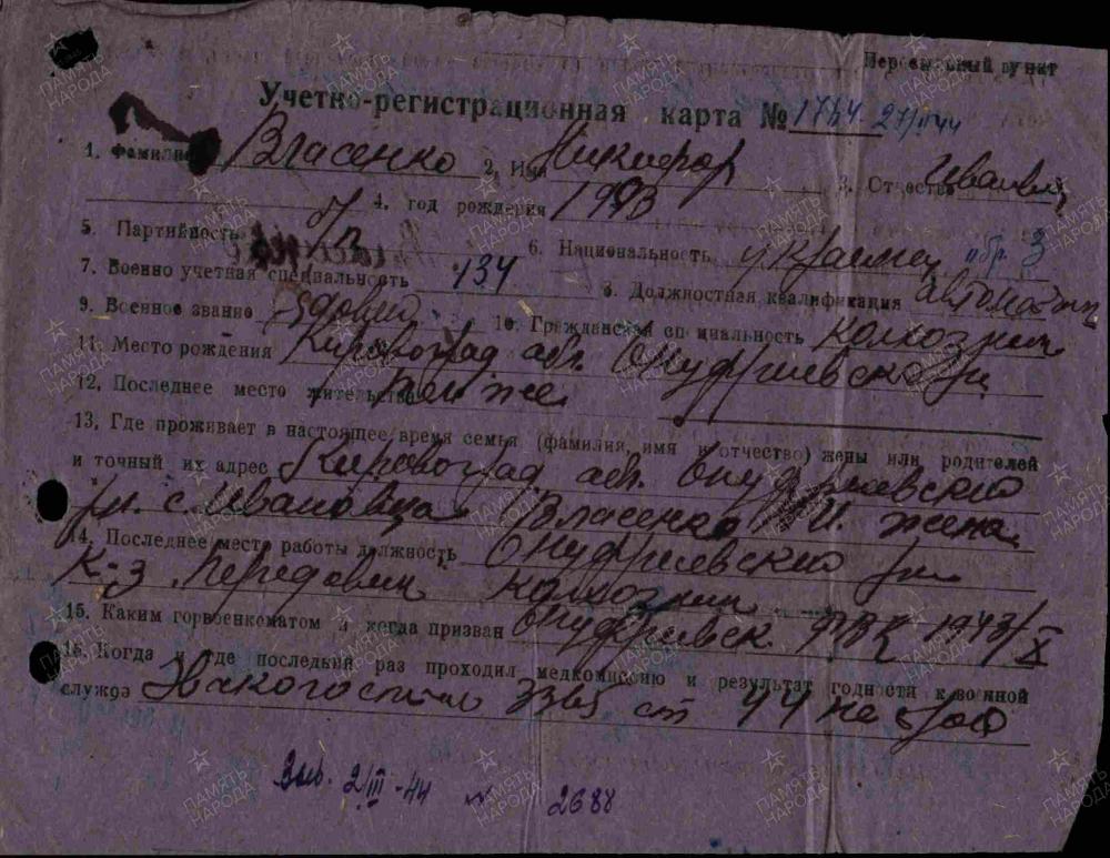 Власенко Никифор Иванович Дата рождения ..1903 Место рождения Украинская ССР, Кировоградская обл., Онуфриевский р-н; Краснодарский край, Лабинский р-н, ст. Владимирская; Новосибирская обл., Венгеровский р-н, Сибирцевский 1-й с/с Дата призыва __.10.1943 Воинское звание рядовой