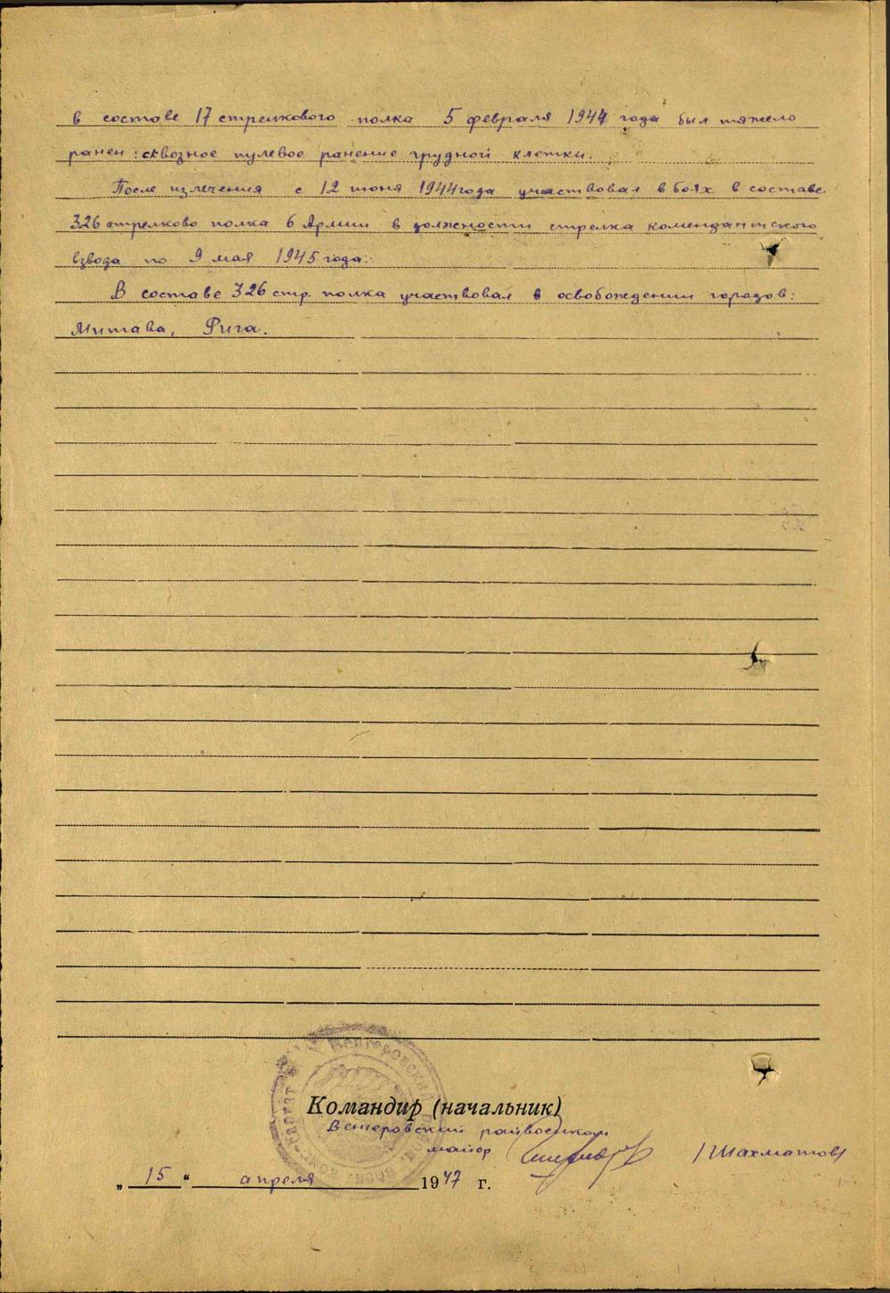 Мой прадед Власенко Никифор Иванович (1903-1985) , рядовой был ранен в 1943г. недалеко от Риги, награжден медаль. «За боевые заслуги», орденом Отечественной войны 1 степени.