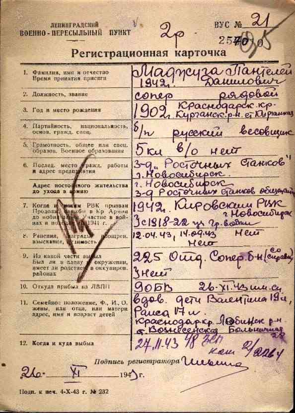 ПАМЯТЬ НАРОДА. Маджуга (Магжуга) Пантилей (Пантелей) Данилович ..1902 Краснодарский край, Курганинский р-н, ст. Курганская, Место службы: 225 осб, 1025 сп, 225 сапб Дата рождения ..1902 Место рождения Краснодарский край, Лабинский р-н, ст. Вознесенская ; Краснодарский край, Курганинский р-н, Курган Дата призыва ..1942 Воинское звание красноармеец ; рядовой
