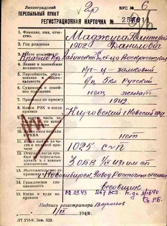 Магжуга Пантилей (Пантелей) Данилович Дата рождения: ..1902 Место рождения: Краснодарский край, Лабинский р-н, ст-ца Вознесенская Дата и место призыва: Кировский РВК, Новосибирская обл. Воинское звание: красноармеец Воинская часть: 1025 сп