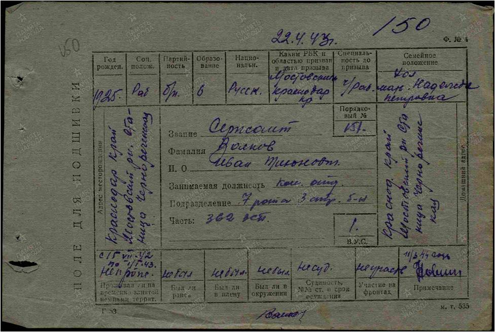 22.04.1942 Мостовской РВК Краснодарского кр. Мостовский р-н призван в ряды РККА.