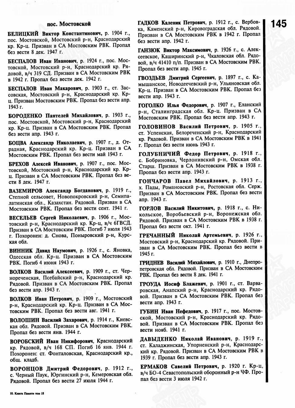 Волков Василий Алексеевич -уроженец ст. Чернореченской, Дата рождения ..1909. Призван в ряды РККА 00.07.1941 Мостовским РВК Краснодарского кр. Мостовского р-на. Был женат- Волкова Мария Карповна.Она вовремя войны проживала в ст. Чернореченской. Считался пропавшим без вести с _04.1943 года,но ,согласно вновь выявленной информации, в сентябре 1941 года попал в плен. Место пленения: Полтава Лагерь: шталаг VI K (326), шталаг VI A Лагерный номер: 26602. Дата пленения: 18.09.1941. Дальнейшая судьба не известна. Фамилия и инициалы Волкова В.А.выгравированы на памятнике в ст. Чернореченской.