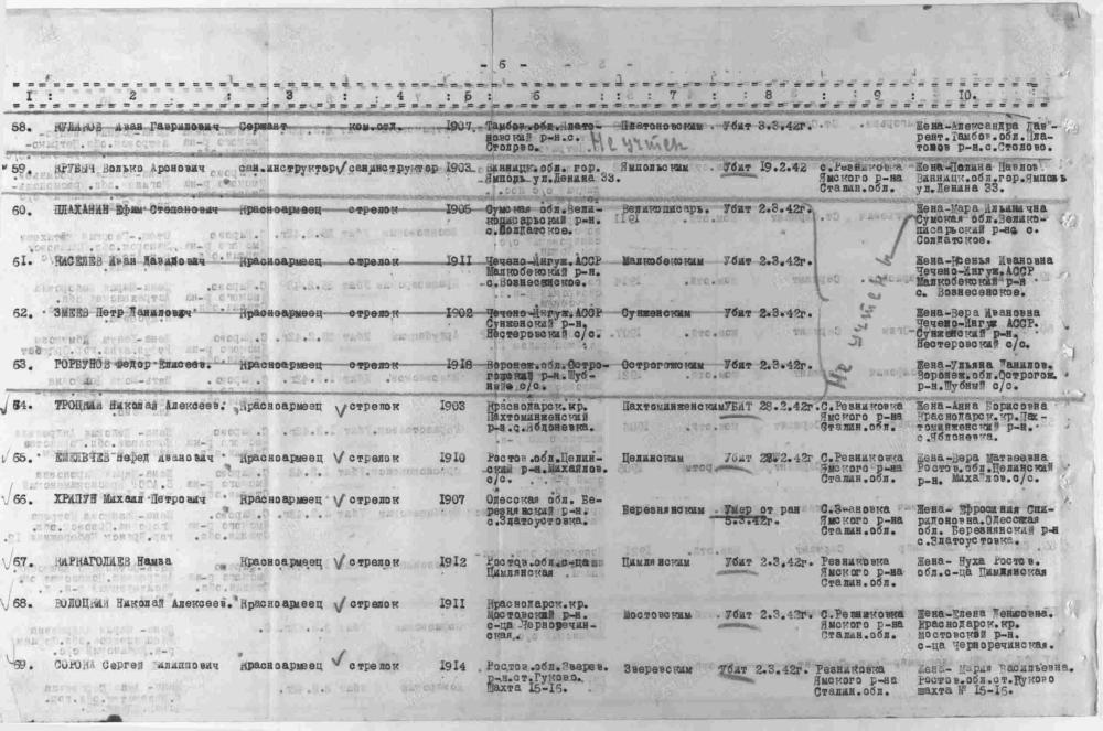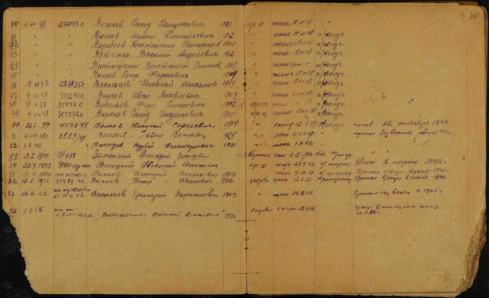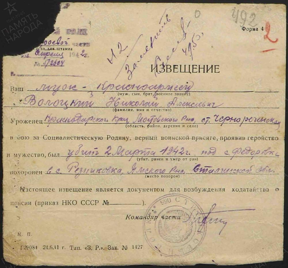 Волоцкий Николай Алексеевич. Дата рождения: ..1911. Уроженец ст. Чернореченской Краснодарский край, Псебайский р- н . Дата призыва: Мостовский РВК, Краснодарский край, Мостовский р-н. Воинское звание: красноармеец. Последнее место службы: 296 стрелковая дивизия. В ст. Чернореченской проживала жена- Елена Денисовна. Убит. 02.03.1942. Место выбытия: Украинская ССР, Сталинская обл., Ямский р-н, с. Раздоловка, в районе. Страна захоронения: Украина. Регион захоронения: Донецкая обл. Место захоронения: Артемовский р-н, Резниковский с/с, с. Кирово, возле НСШ Могила: могила 57 Захоронение: 83778617 Имя Волоцкого Н. А. не внесено на памятнике "Погибшим землякам" ст. Чернореченской.
