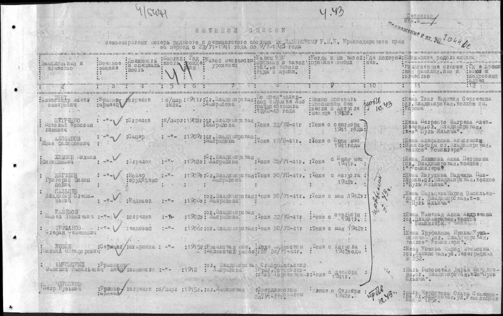 Родился 1902г в станице Владимирской. Беспартийный. 22.08.1941г(12.09.1941г) призывался в ряды Красной Армии Лабинским РВК. Пропал без вести в марте 1943г.