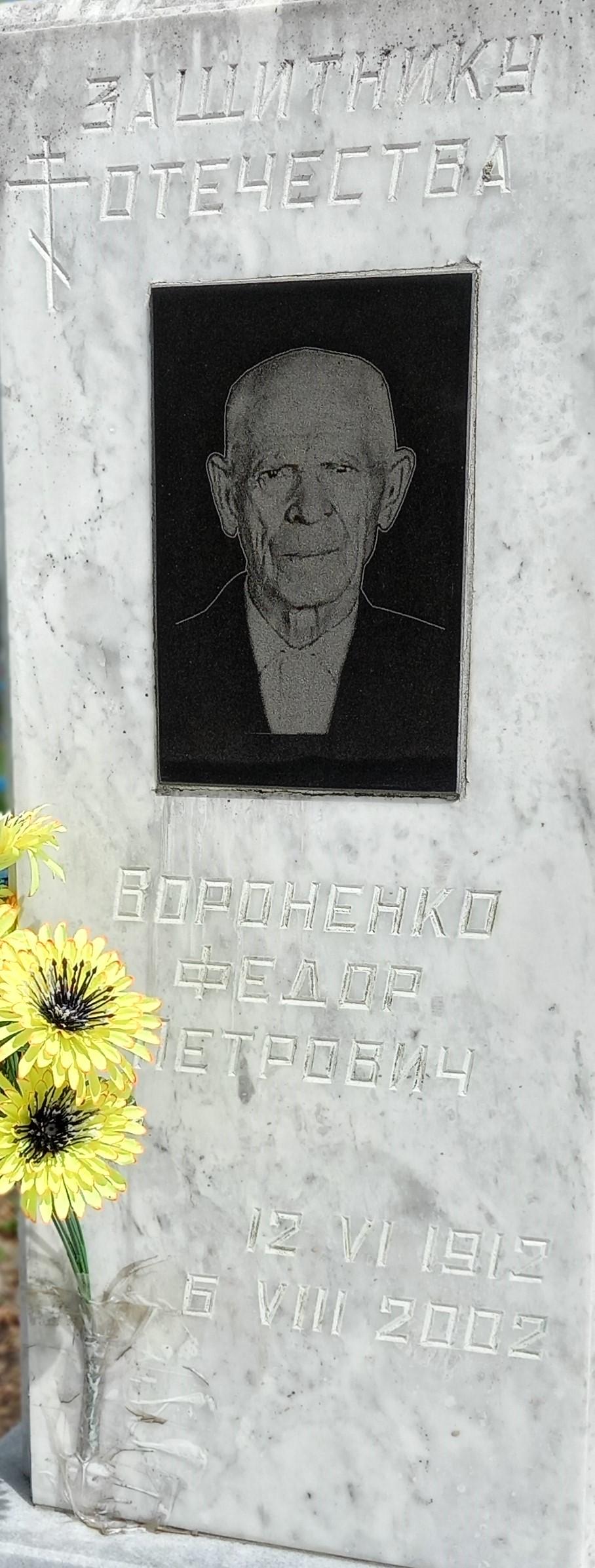 Родился в 1912 году в станице Упорной. Воевал в 195-м стрелковом полку. Награжден орденом Отечественной войны I степени и юбилейными медалями. После войны проживал в Лабинском районе, работал в колхозе. Умер в возрасте 90 лет, похоронен на кладбище станицы Упорной. Имя Федора Петровича Вороненко внесено в Книгу Памяти: "Фронтовики" О ветеранах Краснодарского края - участниках Великой Отечественной войны 1941-1945 гг., вернувшихся домой с Победой".