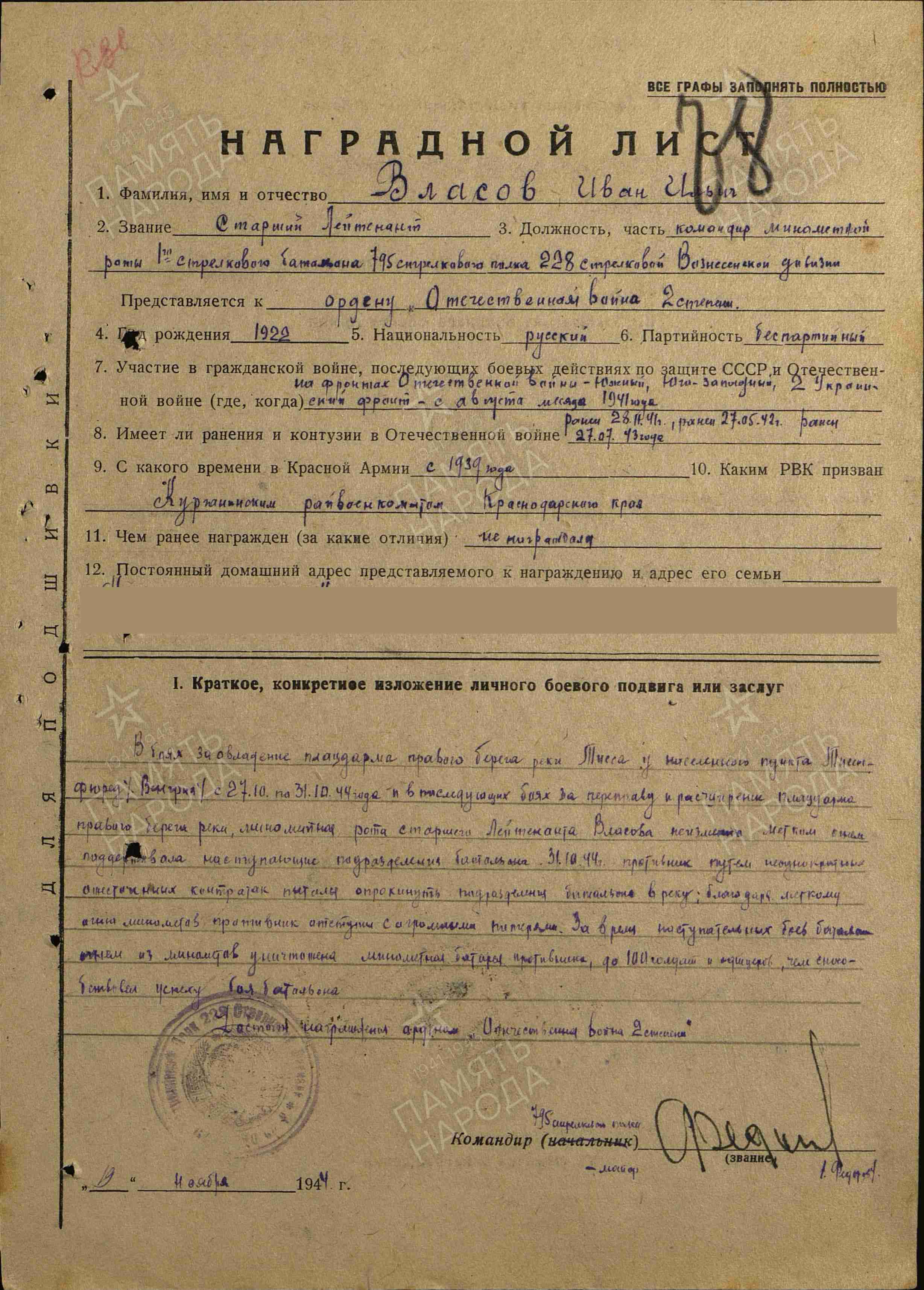 Власов И.И. родился 15.05.1922 г.в станице Чамлыкской. В армию призван в октябре 1939 года. Старший лейтенант, командир минометной роты. После войны вернулся в станицу Чамлыкскую. Умер в 2004 году.