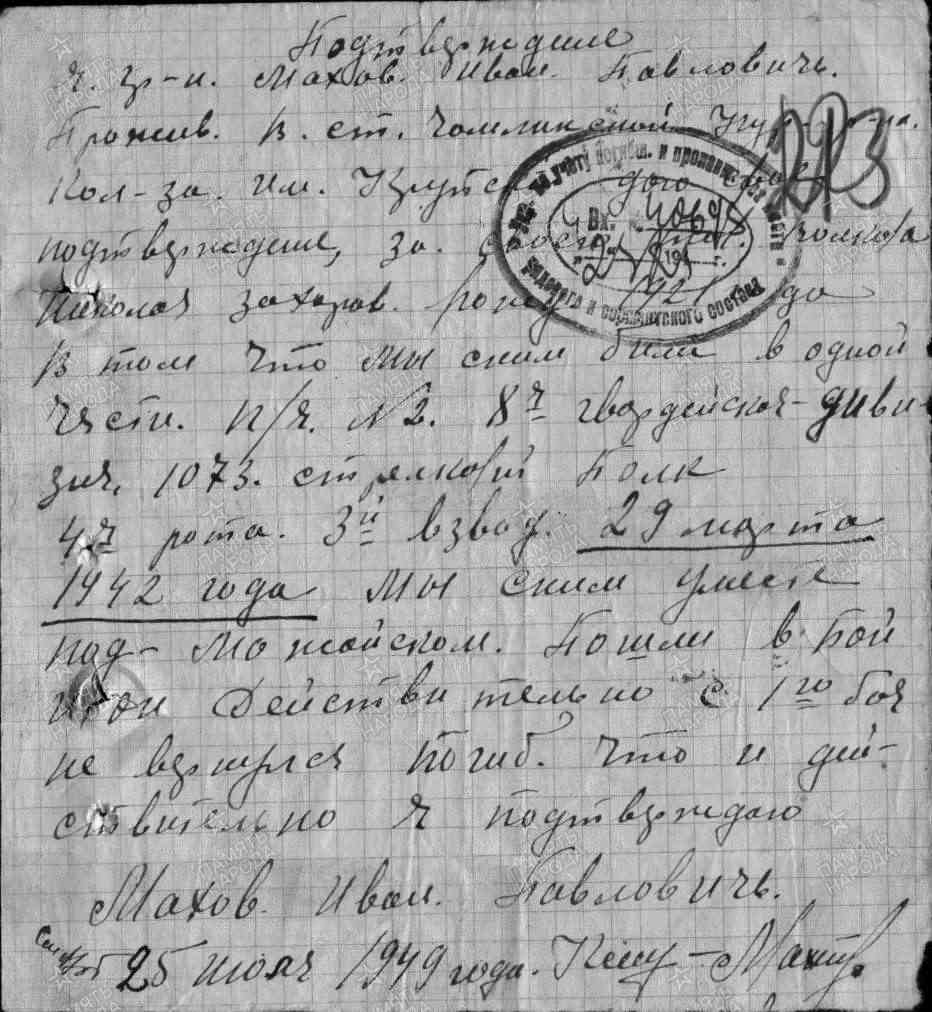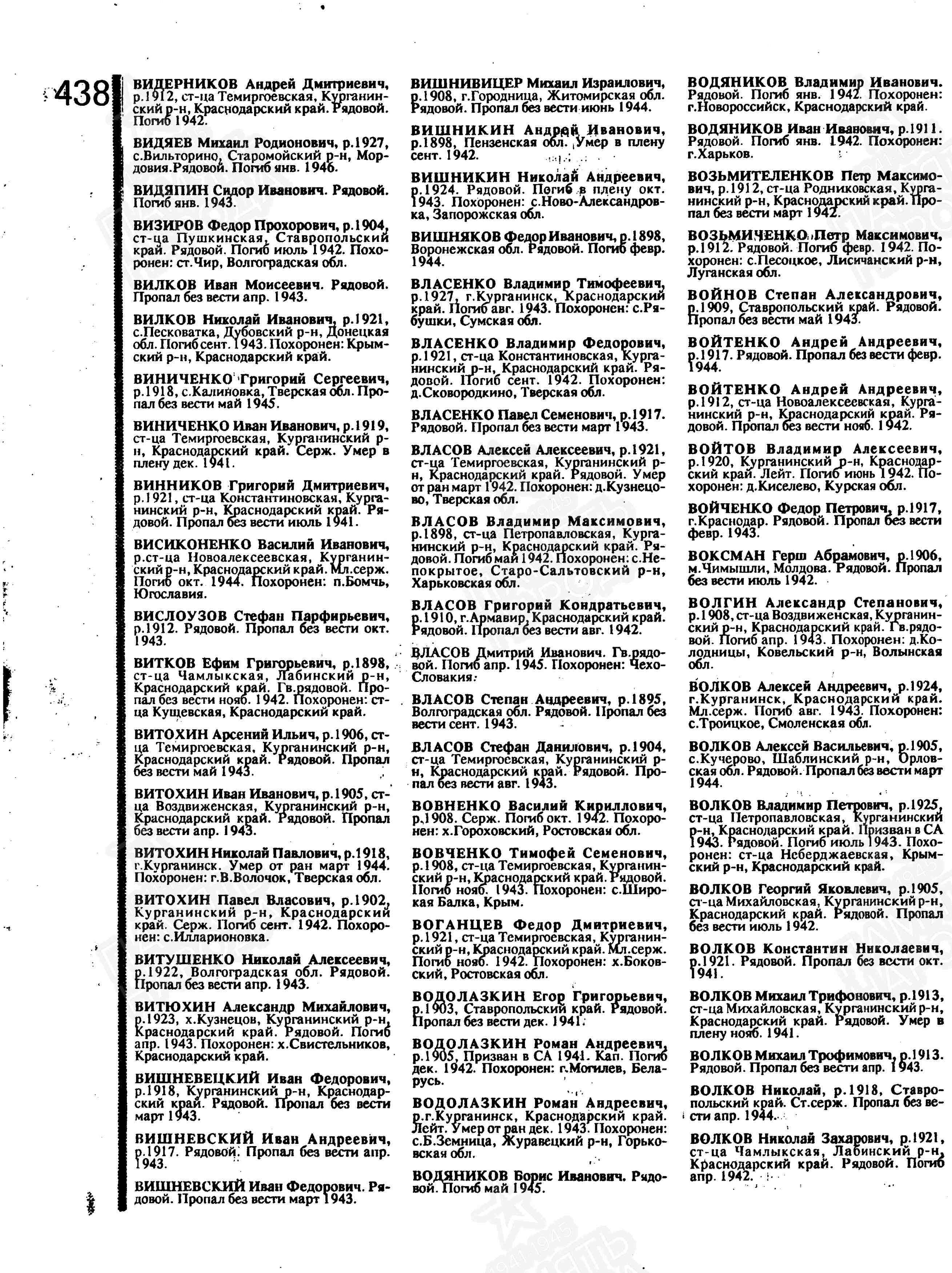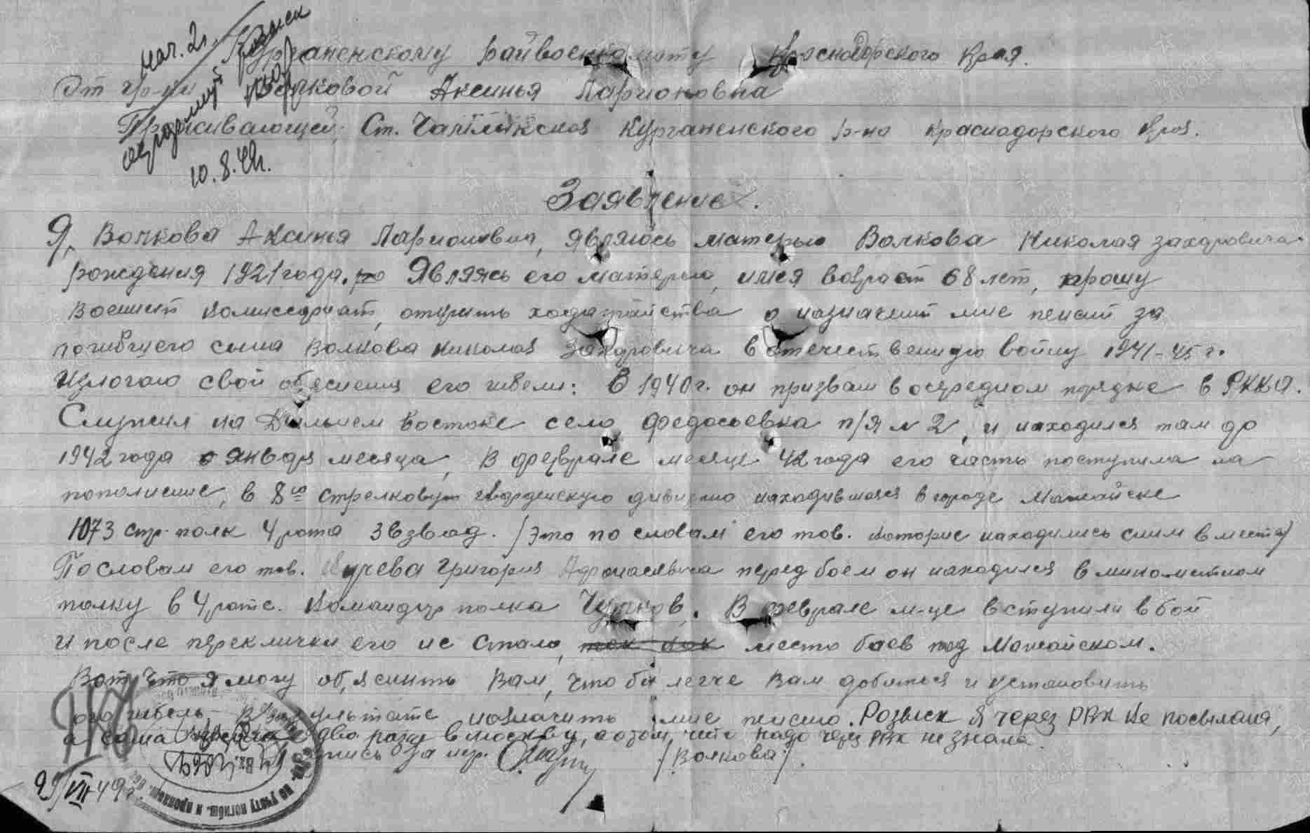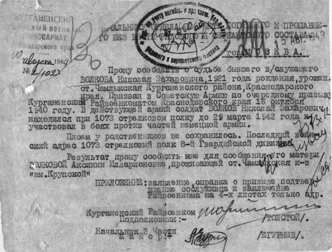 Волков Н.З. родился в станице Чамлыкской в 1921 году. На фронт призван 16.10.1940 г. Погиб в апреле 1942 года.