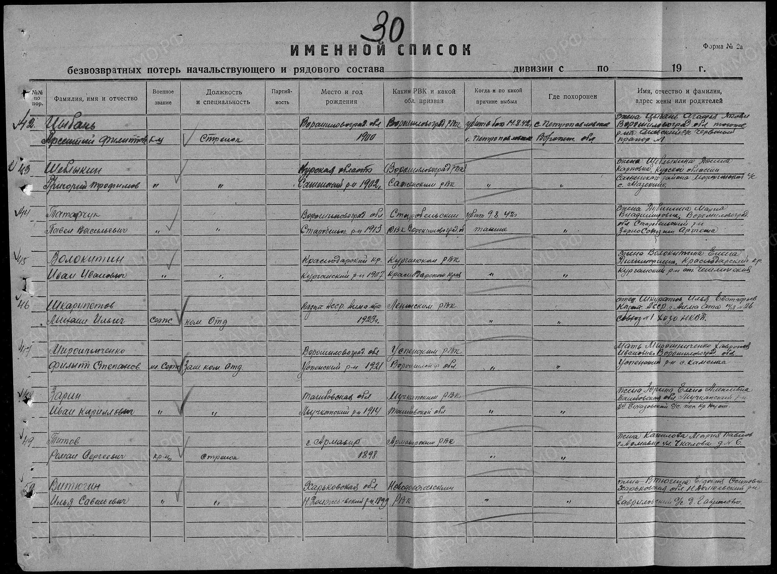 Волокитин И.И. родился в станице Чамлыкской в 1907 году. Убит 09.08.1942 года.