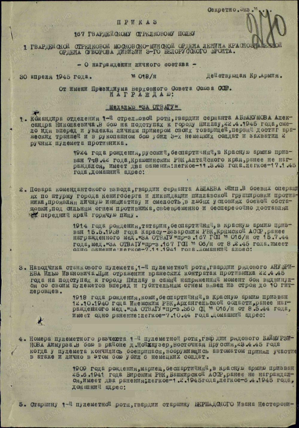 Орден Отечественной войны II степени-06.11.1985. Медаль «За отвагу»Приказ подразделения №: 18/н от: 30.04.1945.