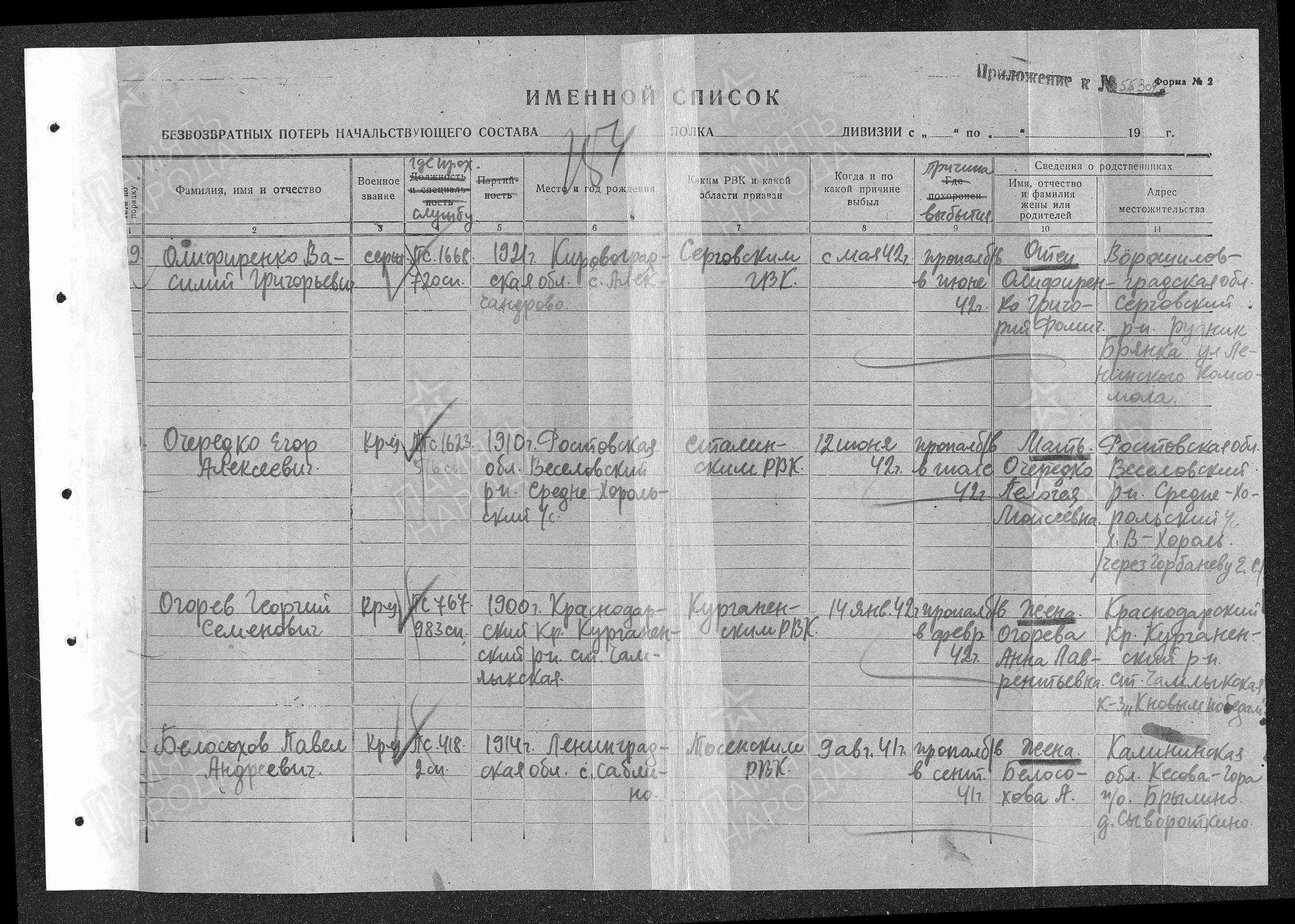 Огорев Г.С. родился в станице Чамлыкской в 1900 году. На фронт призван Курганинским РВК. Пропал без вести в феврале 1942 г.