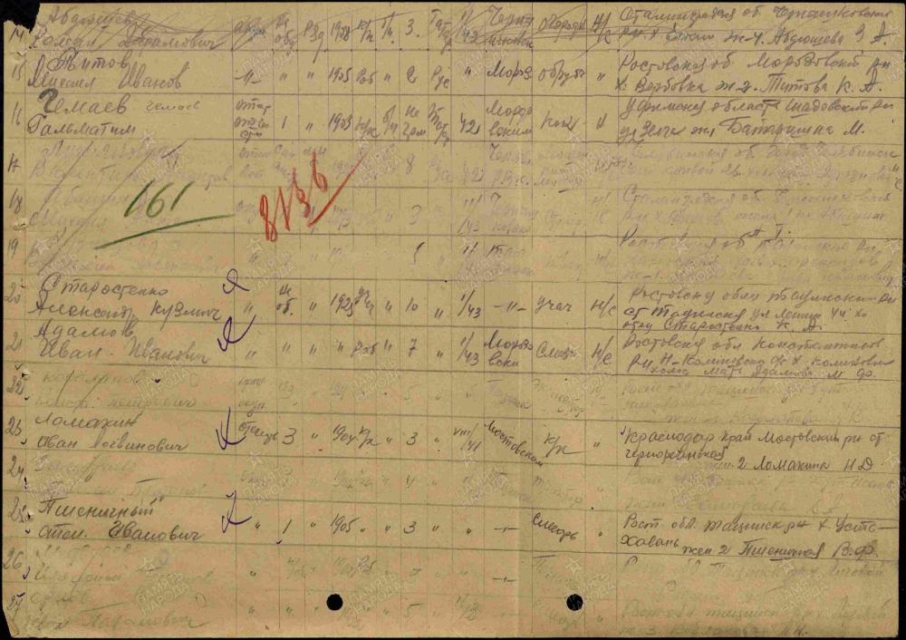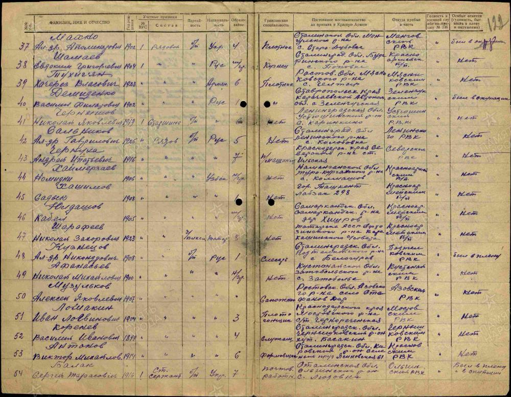 Дата рождения ..1904 Место рождения Краснодарский край, Псебайский р-н, Чернореченский с/с, ст-ца Чернореченская. До войны работал плотогоньщиком. Дата призыва 03.07.1941 Воинское звание красноармеец ; рядовой Воинская часть 116 стрелковый полк 21 стрелковой дивизии. 15 запасная стрелковая бригада. Армавирский военно-пересыльный пункт, Краснодарский край, г. Армавир. 333 стрелковая дивизия. 239 армейский запасной стрелковый полк. 200 запасной стрелковый полк 47 запасной стрелковой бригады. 46 запасной стрелковый полк 15 запасной стрелковой бригады. Мостовский РВК Краснодарский край, Мостовский р-н.