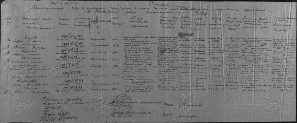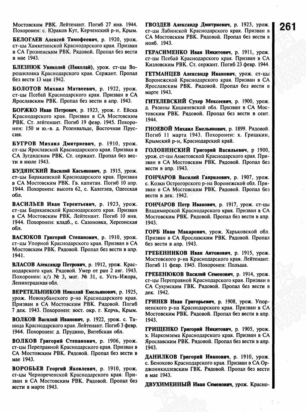 ВОРОБЬЕВ Георгий Яковлевич. Место рождения- Краснодарский край, Псебайский р-н, Чернореченский с/с, ст-ца Чернореченская. Дата рождения ..1910 Призыван на военную службу 18.08.1941 Воинское звание рядовой. Причина выбытия пропал без вести -00.03.1943. Жена- Воробьева Анна Агеевна писем с фронта не получала. Фамилии и инициалов Воробьева Георгия Яковлевича нет на памятнике в ст. Чернореченской.