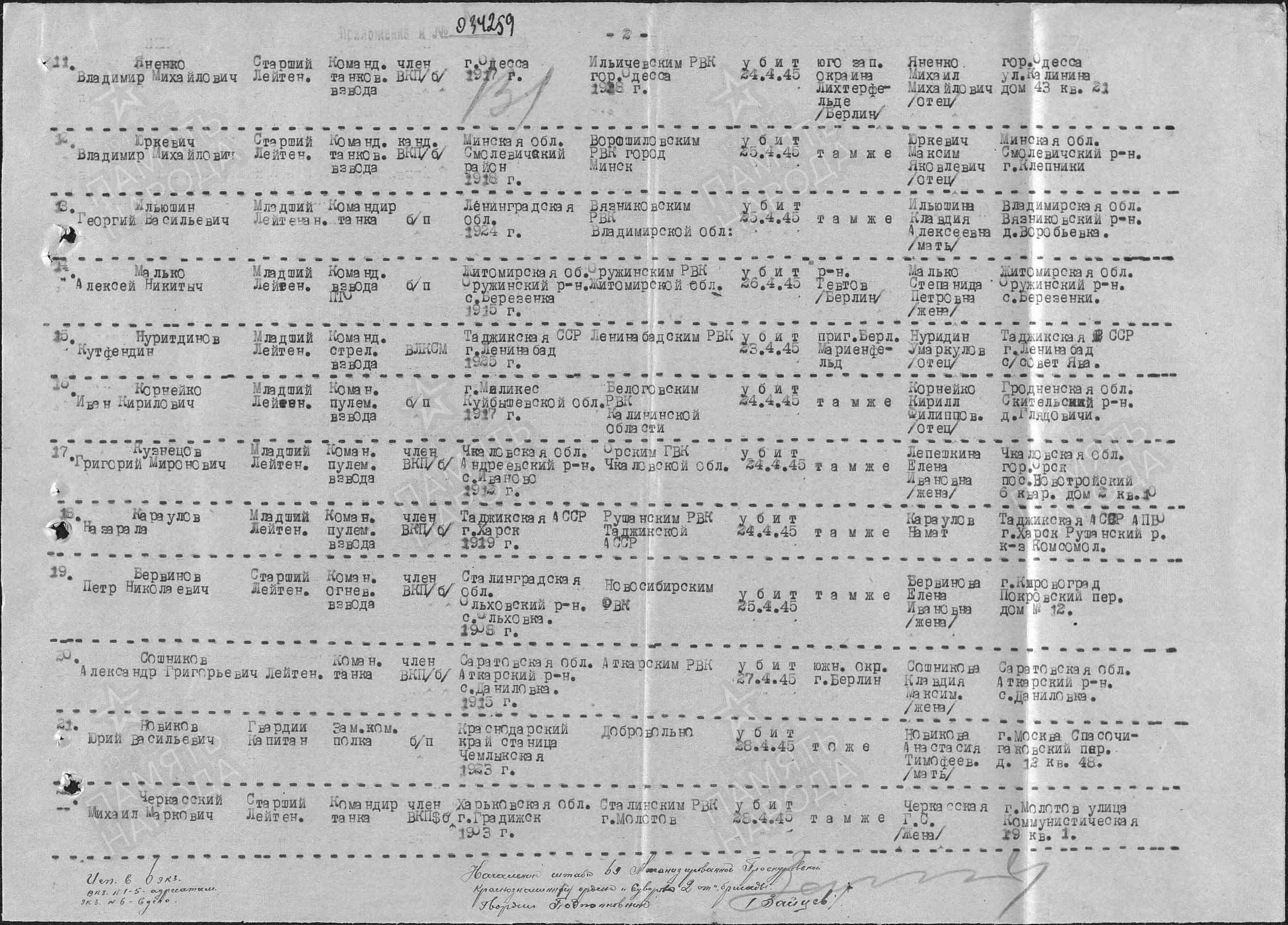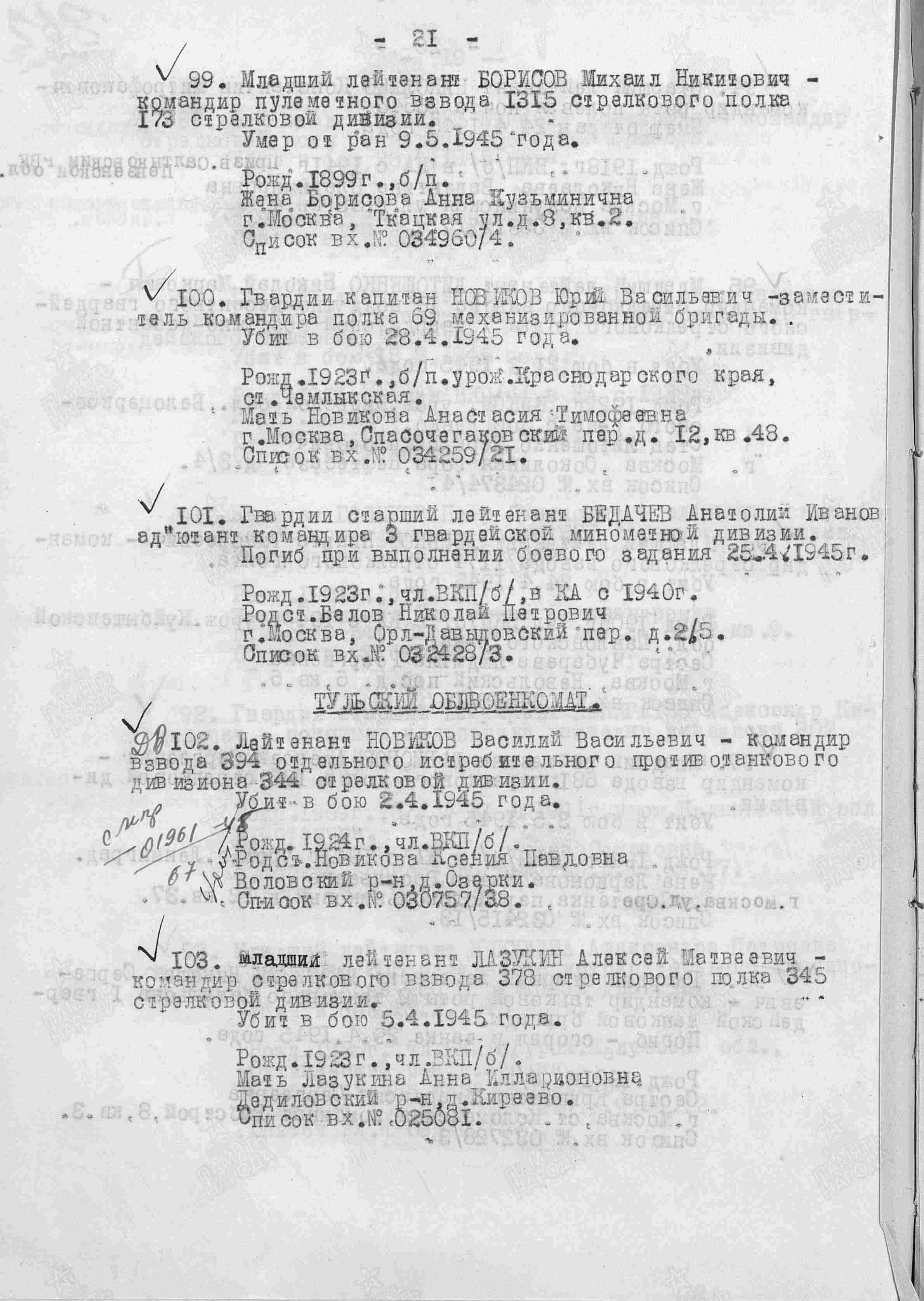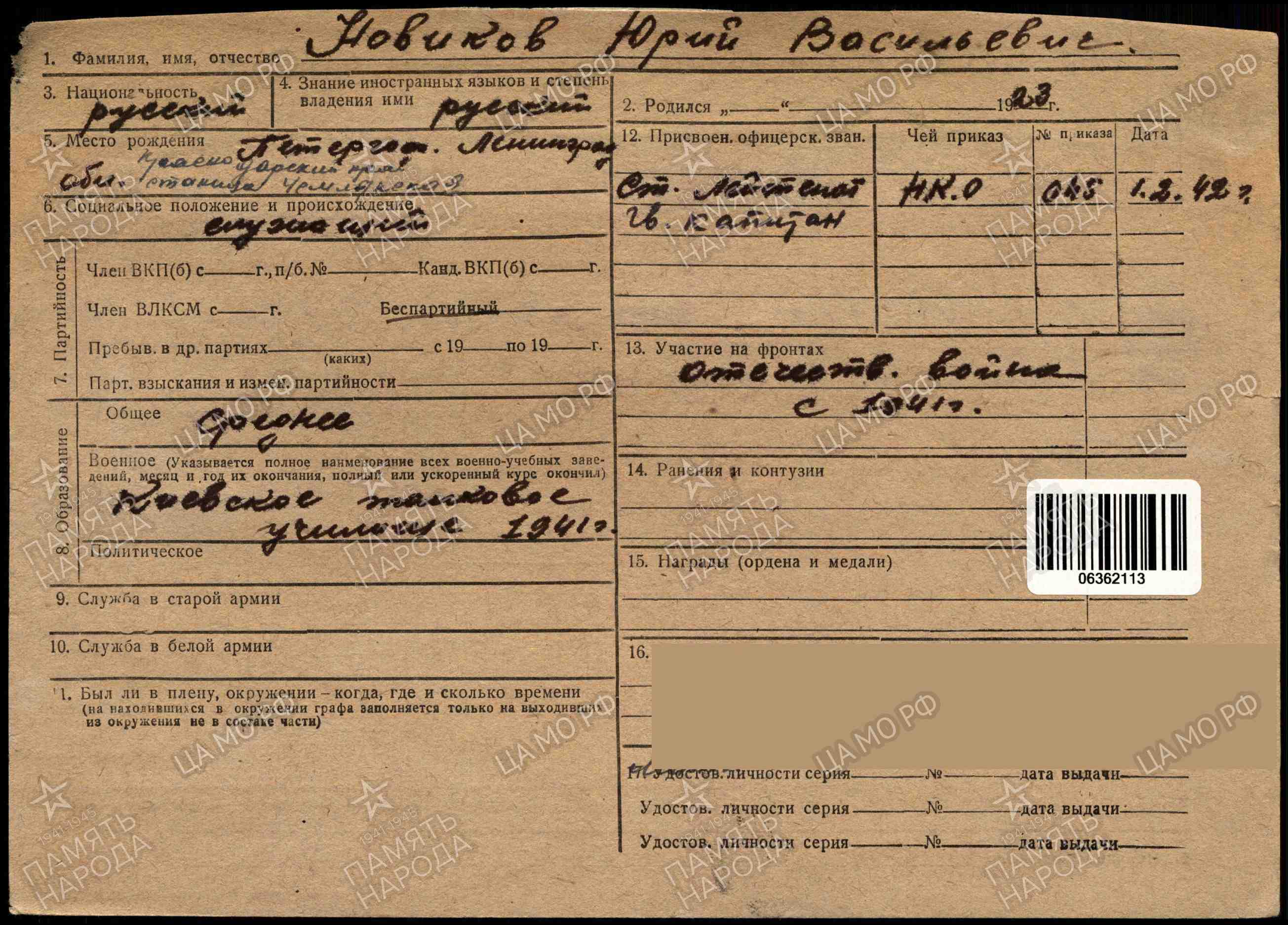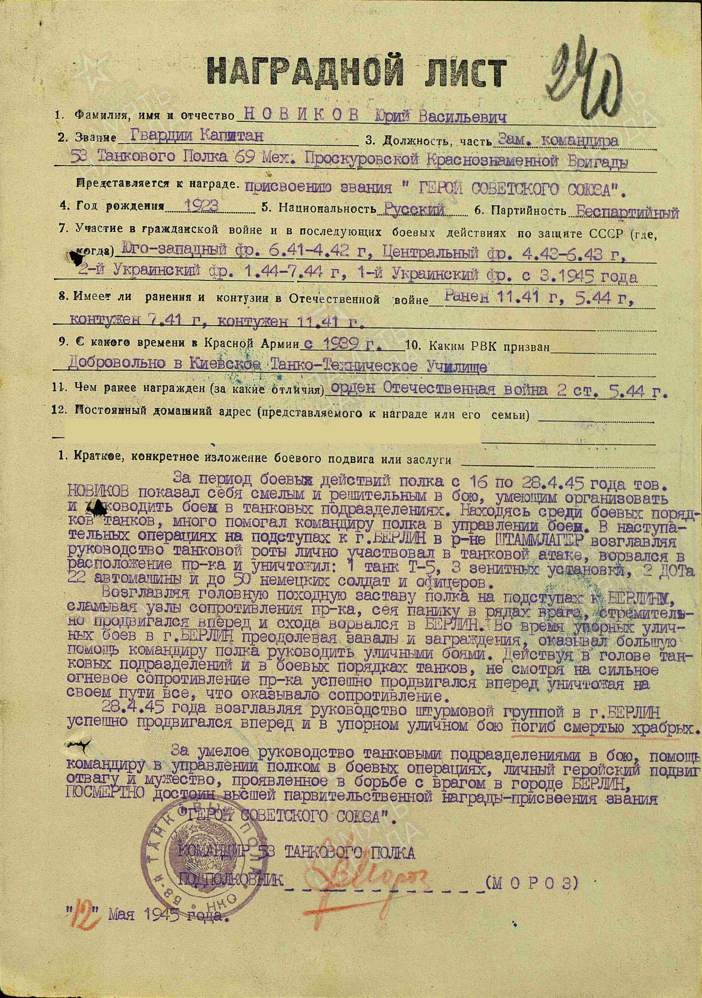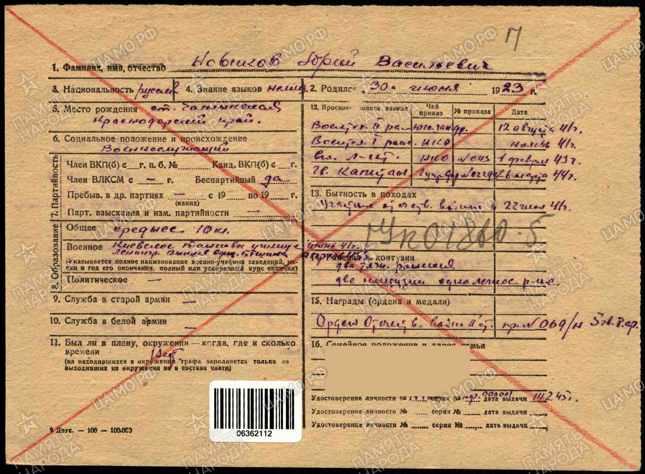 Новиков Ю.В. родился в станице Чамлыкской 30.06.1923 г. После окончания Киевского танко-технического училища добровольцем ушел на фронт. Гвардии капитан, заместитель командира танкового полка. Погиб в бою 28.04.1945 г. Похоронен Германия, г. Берлин, южная окраина.