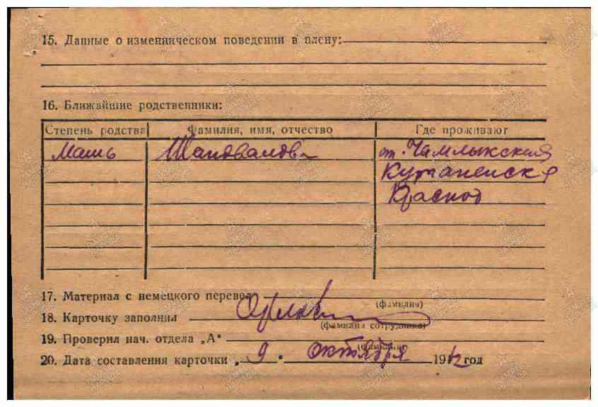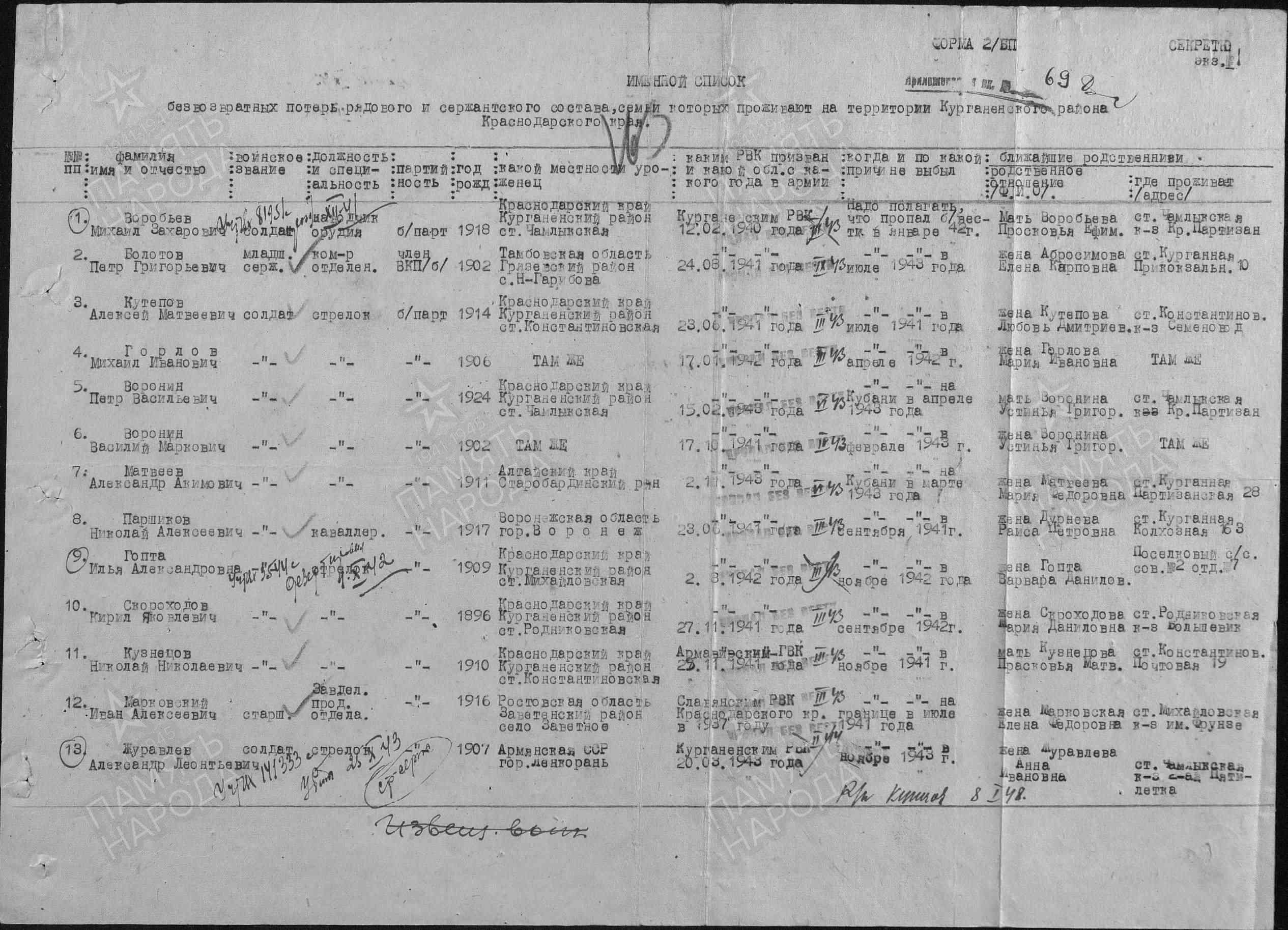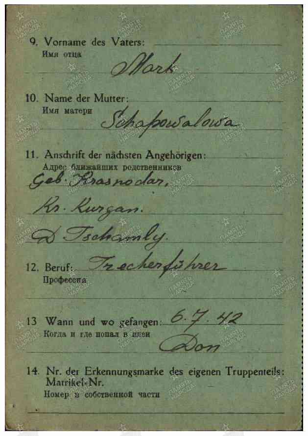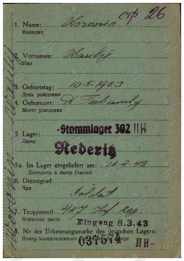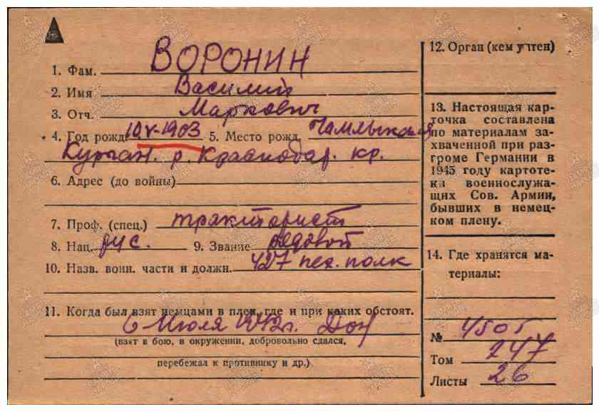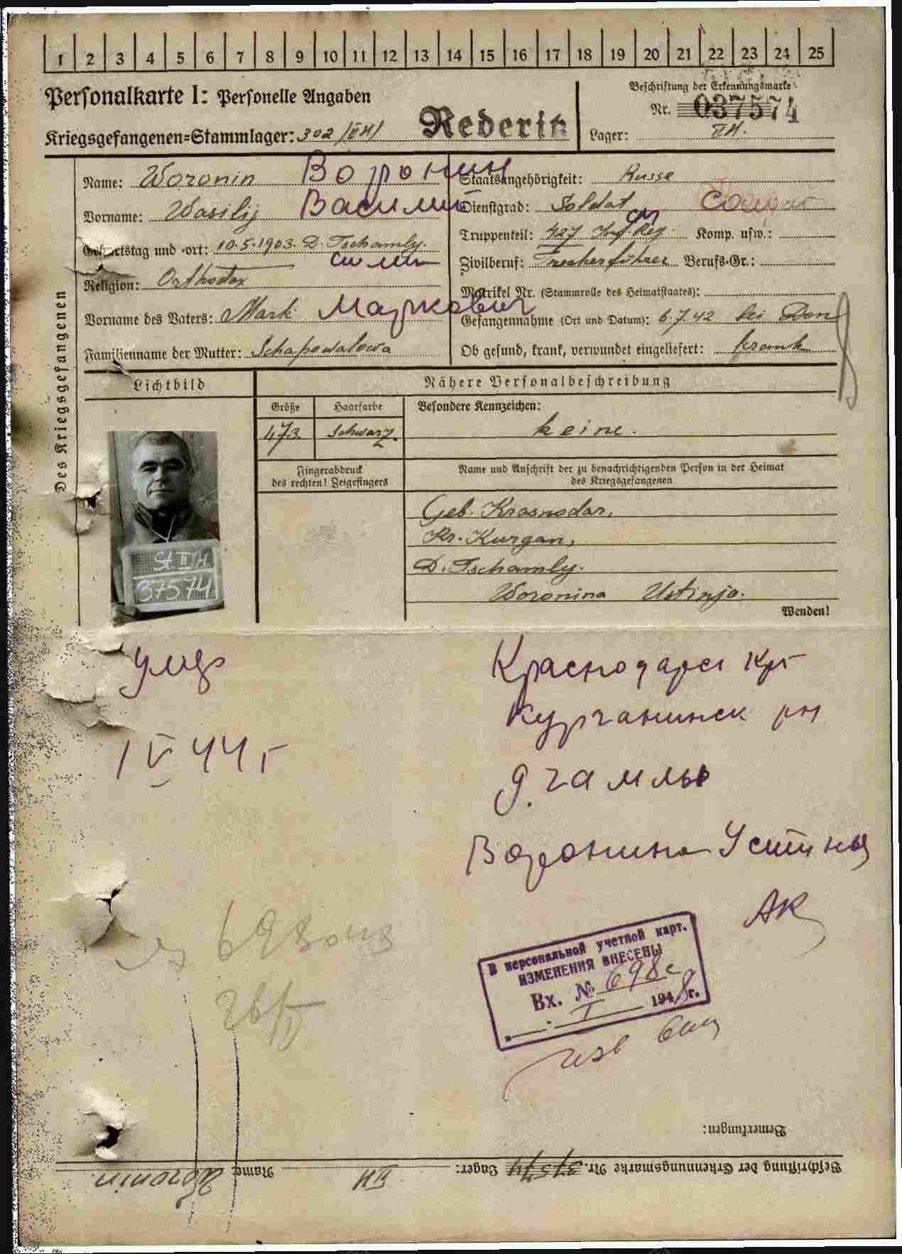 Воронин В.М. родился в станице Чамлыкской 10.05.1903 г. На фронт призван 17.10.1941 г. Попал в плен, Лагерь шталаг 302 (II H) Гросс Борн-Редериц 06.07.1942 г. Умер в плену 01.05.1944 г.