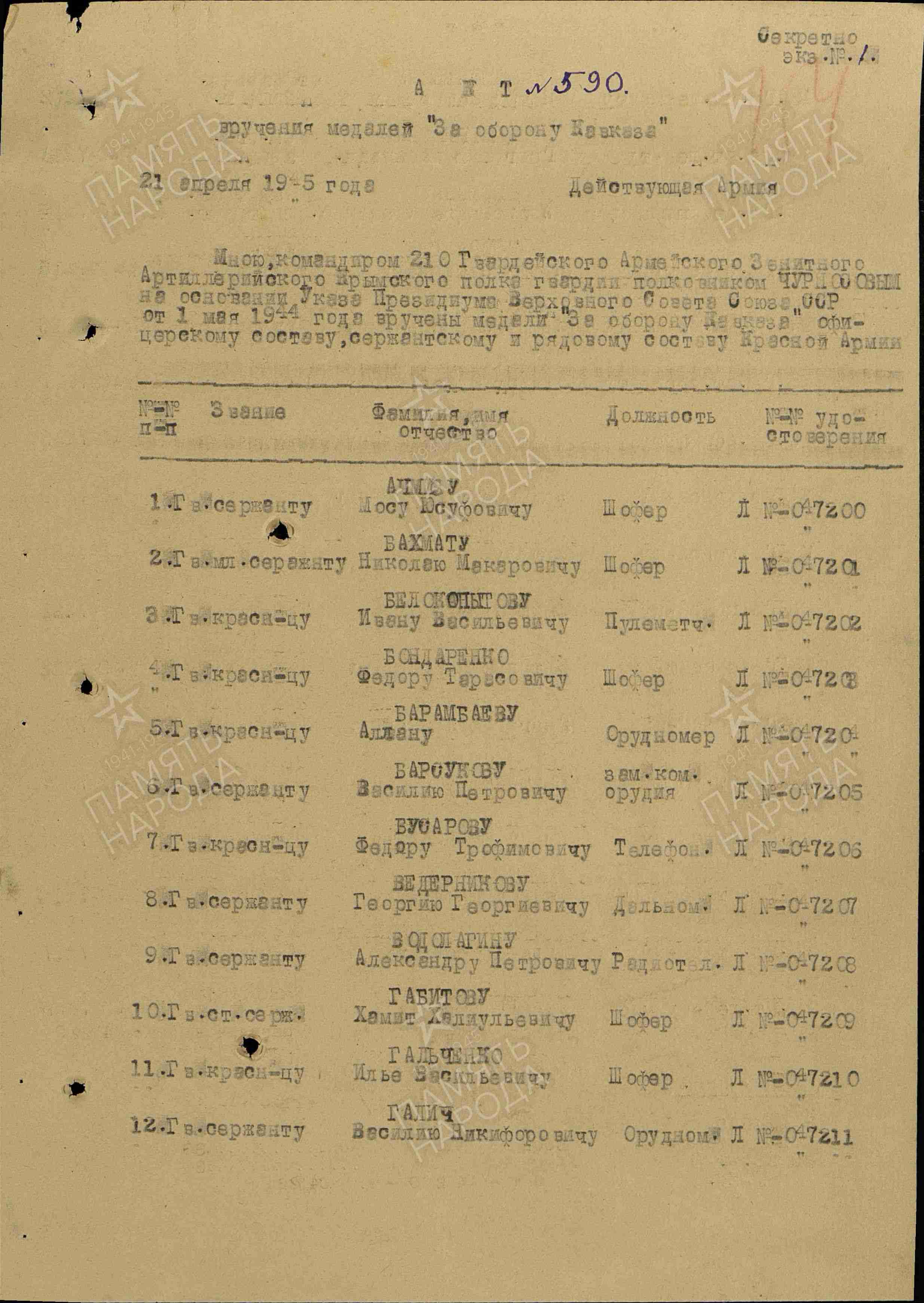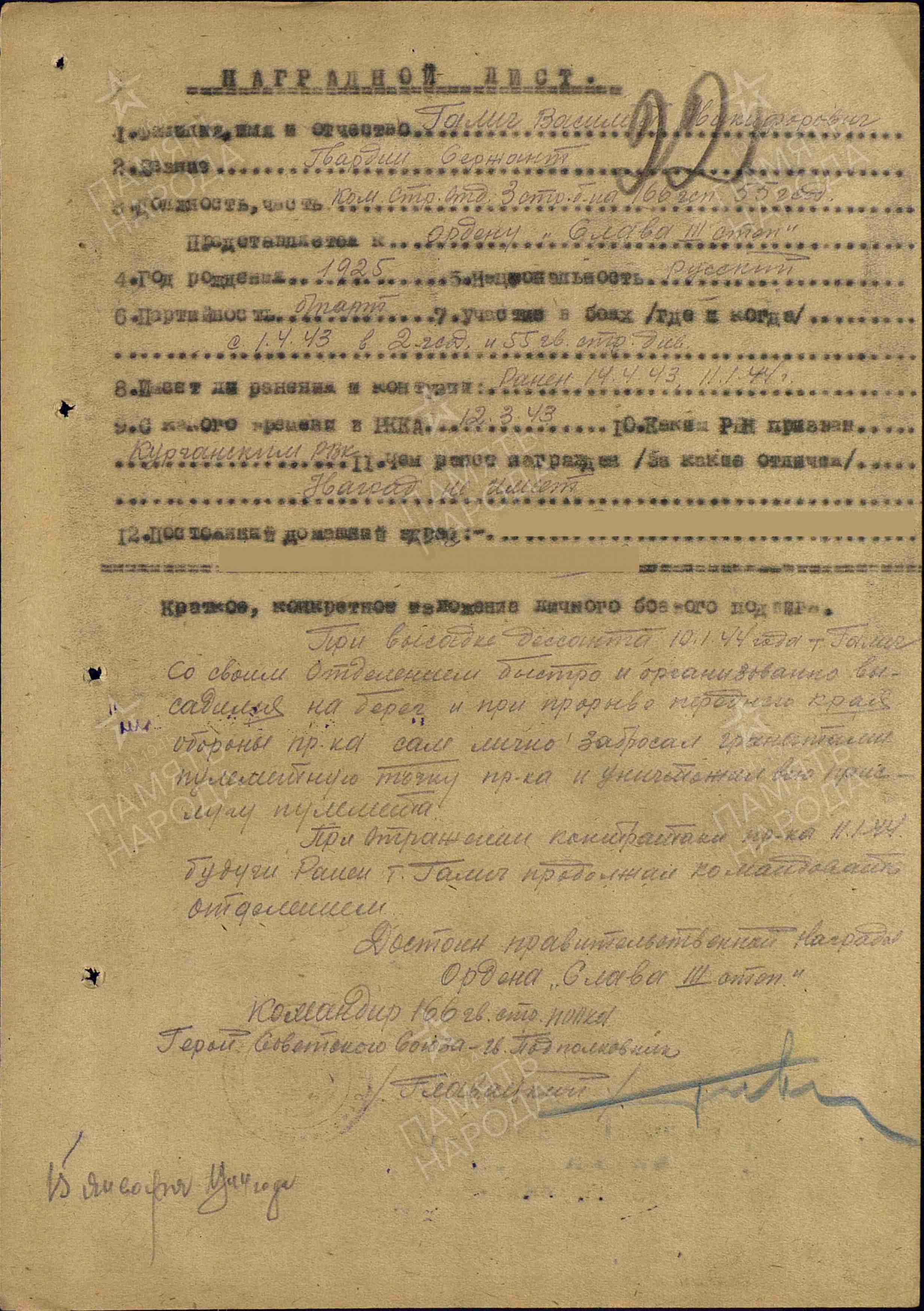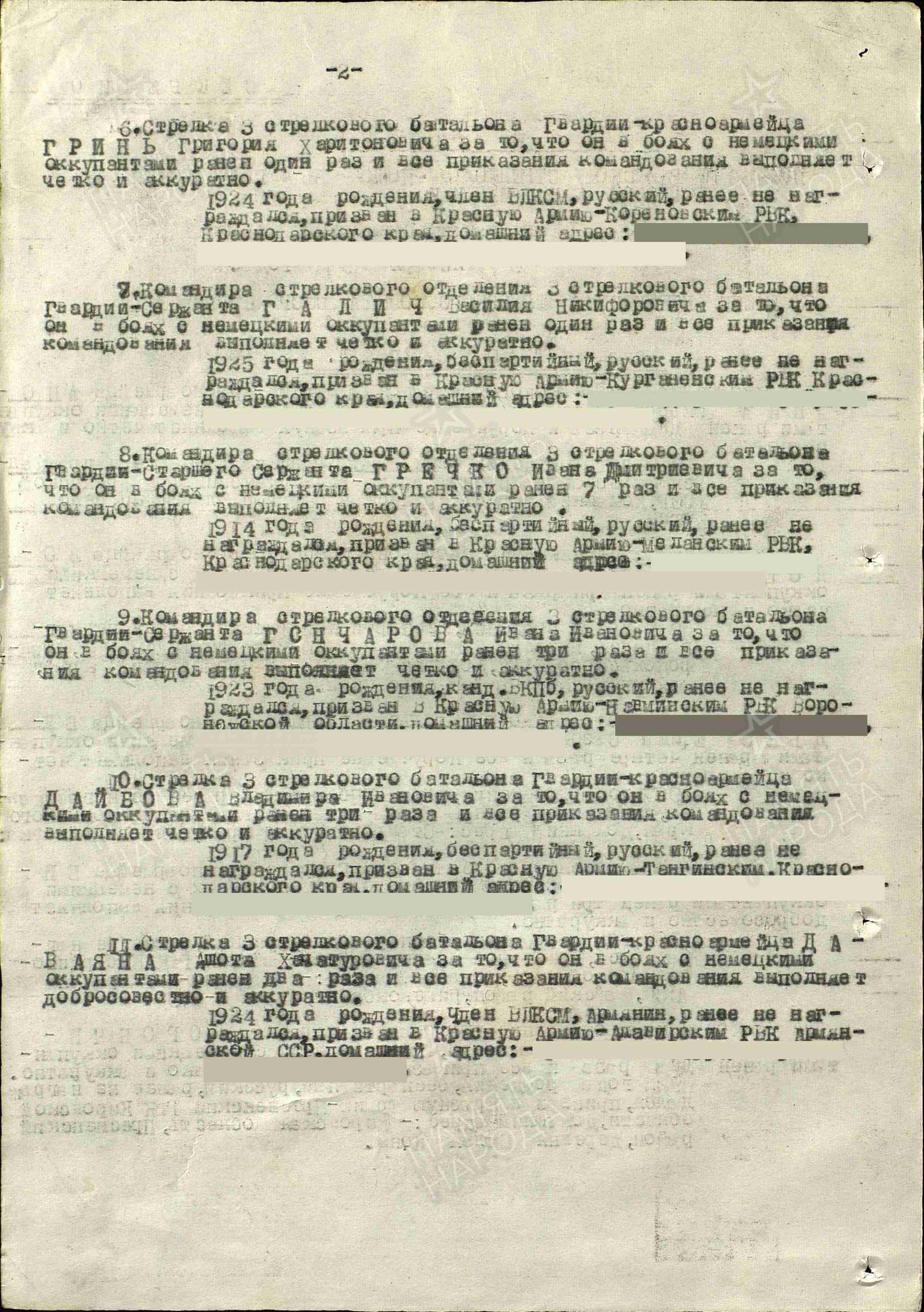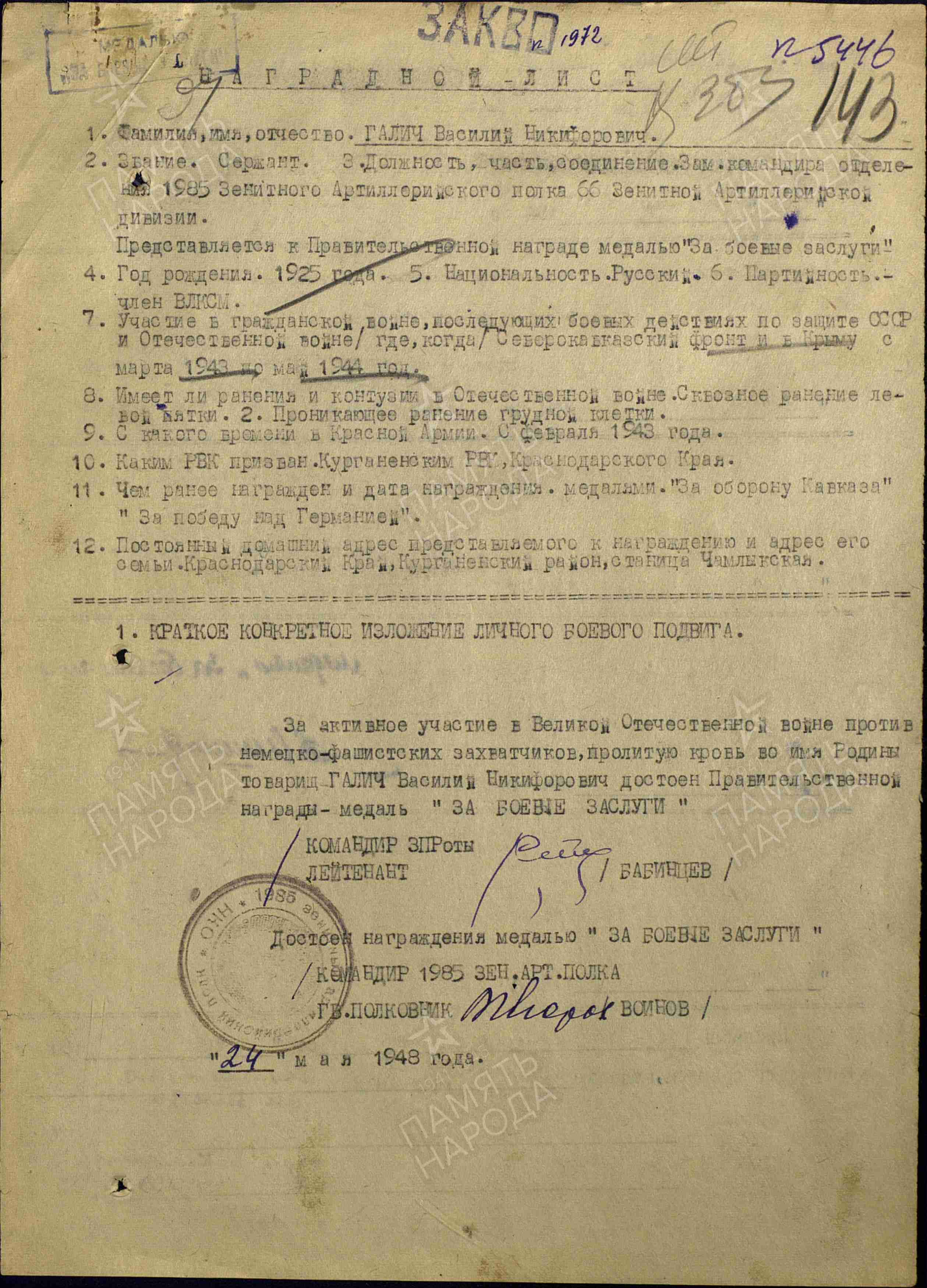 Галич В.Н. родился в станице Чамлыкской в 1925 году. На фронт призван в 1943 г. Старший сержант, заместитель командира стрелкового отделения. Награжден орденом Славы III степени, медалями «За отвагу», «За боевые заслуги», «За оборону Кавказа», «За победу над Германией в Великой Отечественной войне 1941–1945 гг.»