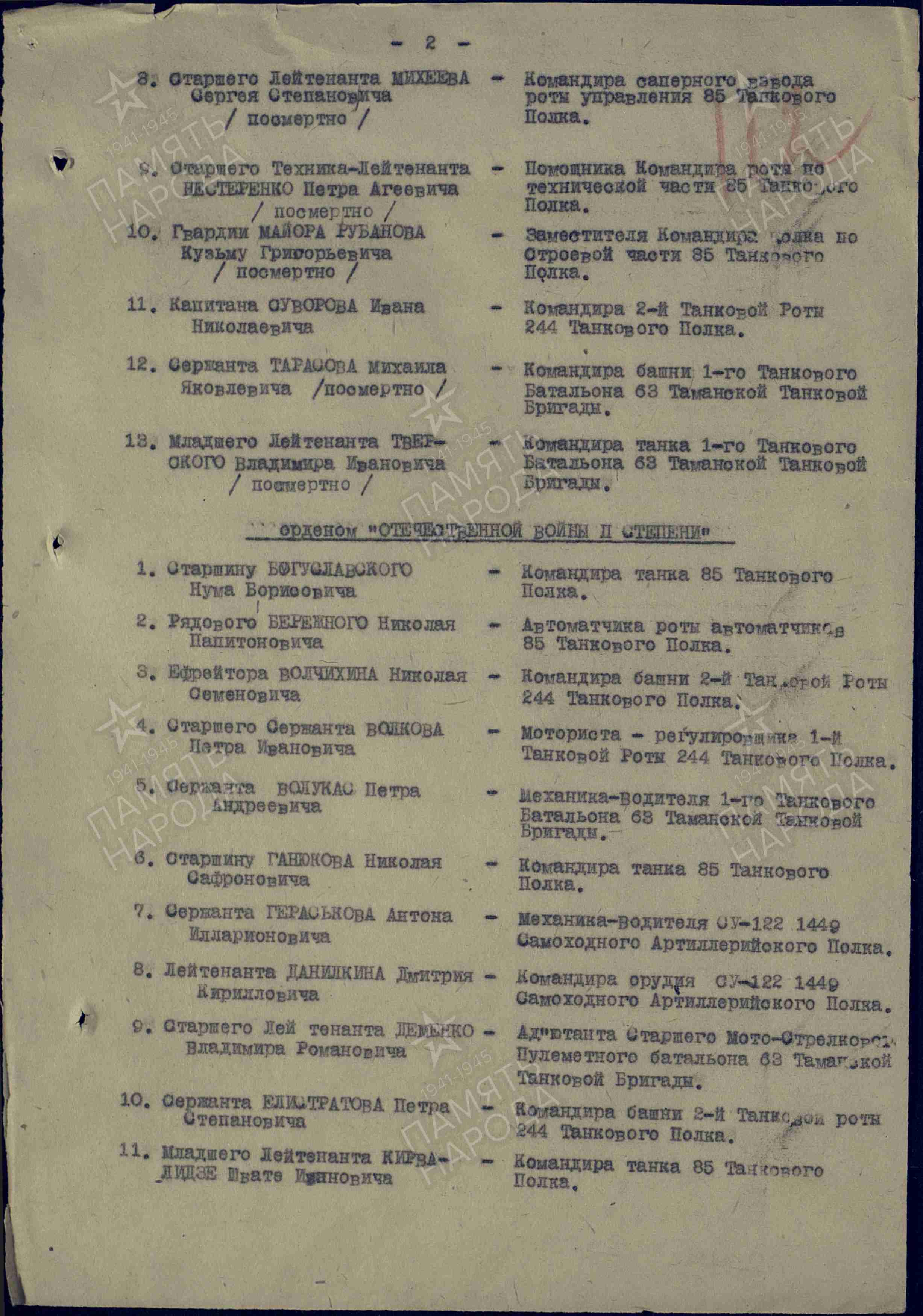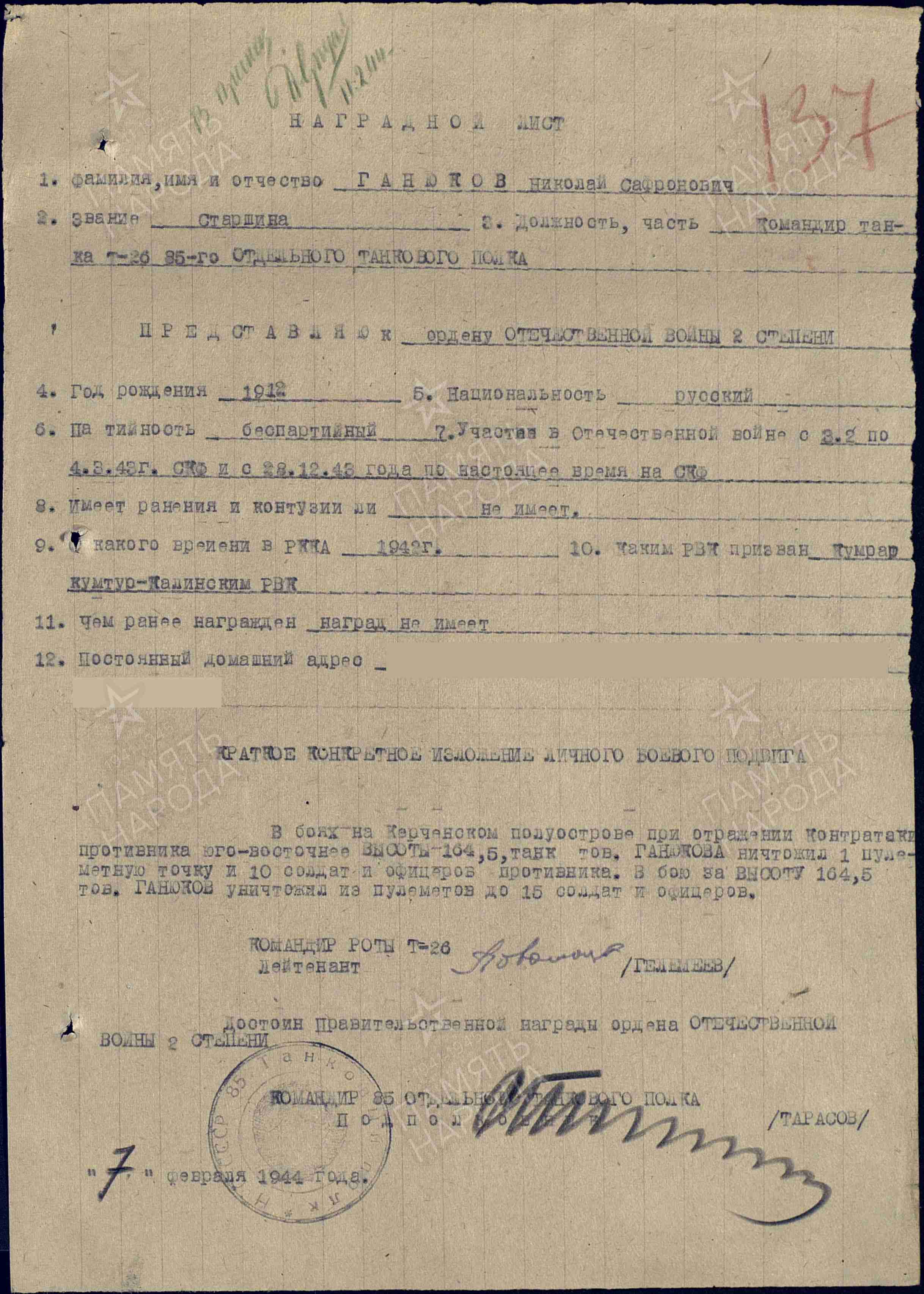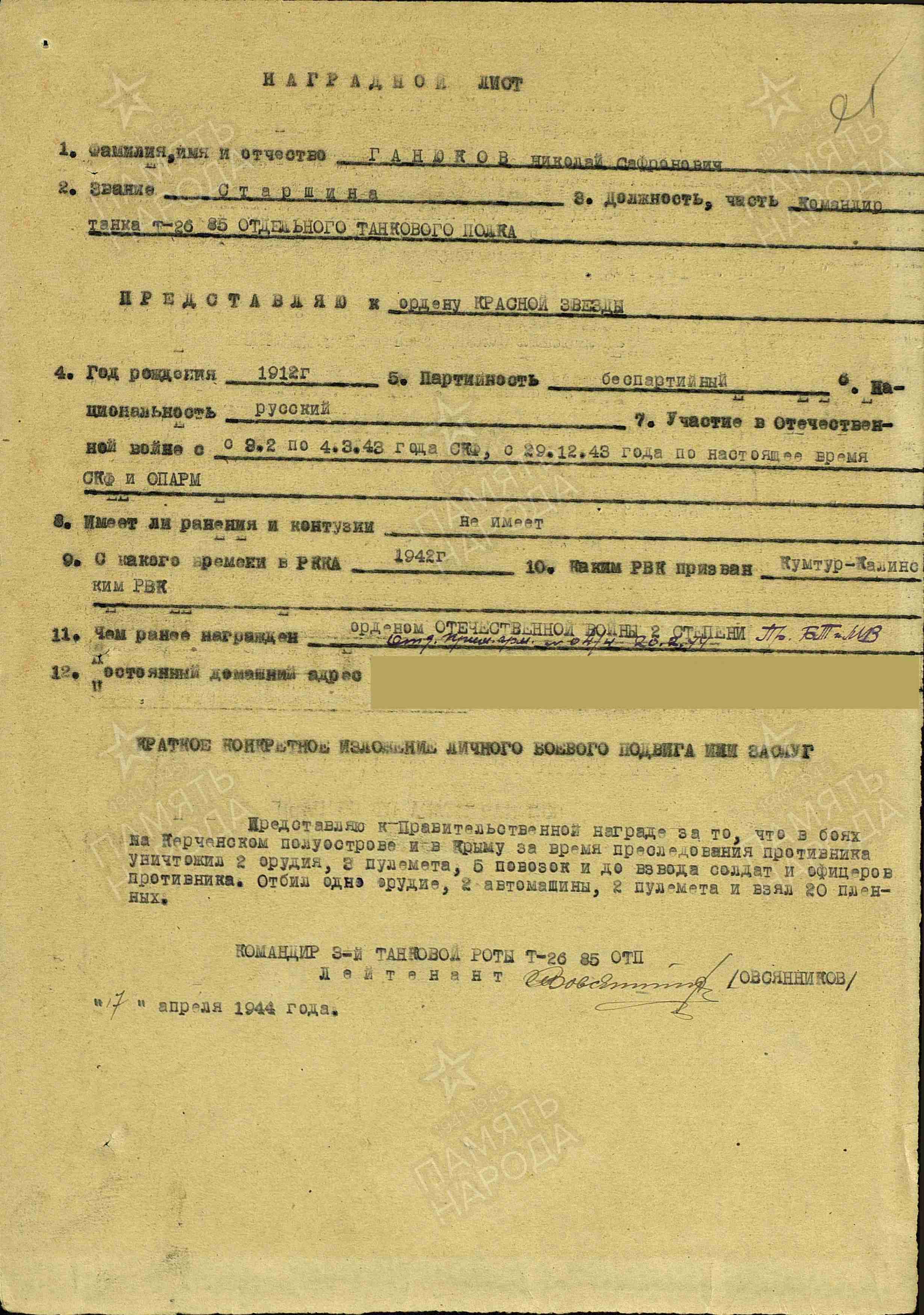 Ганюков Н.С. родился в станице Чамлыкской в 1912 году. На фронт призван в 1942 году. Старшина, командир танка. Убит 10.05.1944 г. Похоронен Крым, Биюк-Сюрень