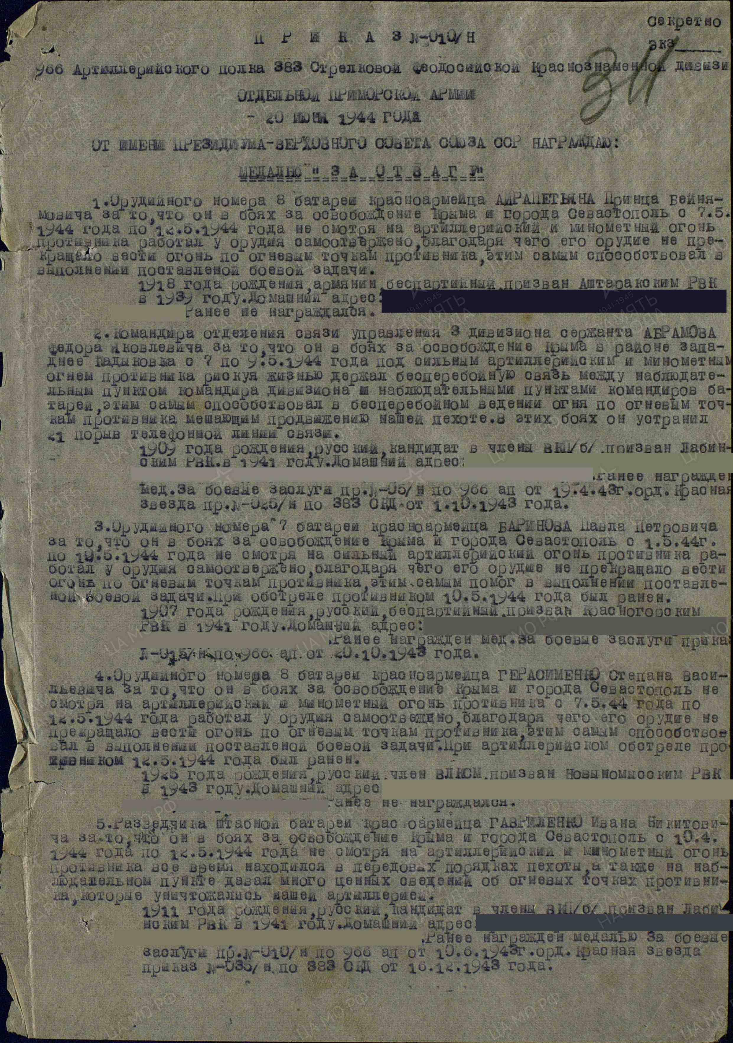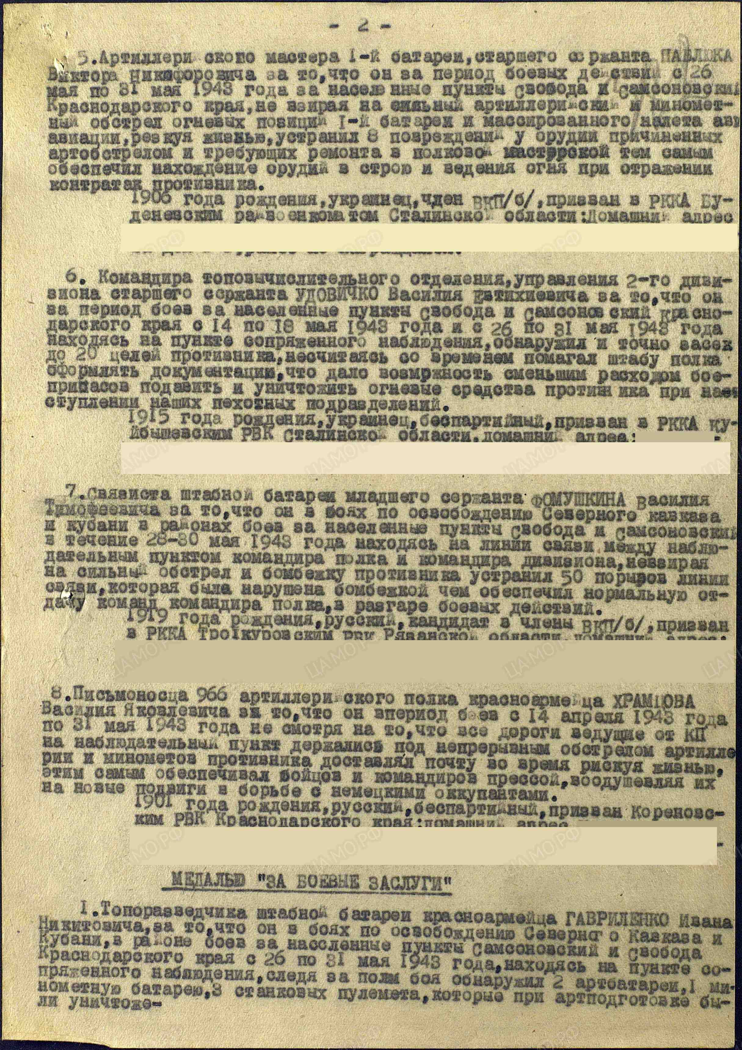 Дата рождения ..1911 Место рождения Краснодарский край, Лабинский р-н, ст. Вознесенская Место призыва Лабинский РВК, Краснодарский край, Лабинский р-н Воинское звание красноармеец Воинская часть 966 артиллерийский полк 383 стрелковой дивизии Награды Медаль «За боевые заслуги» (2) Орден Отечественной войны II степени Орден Красной Звезды (2) Медаль «За отвагу» (2) (2) Гавриленко Иван Никитович Орден Красной Звезды