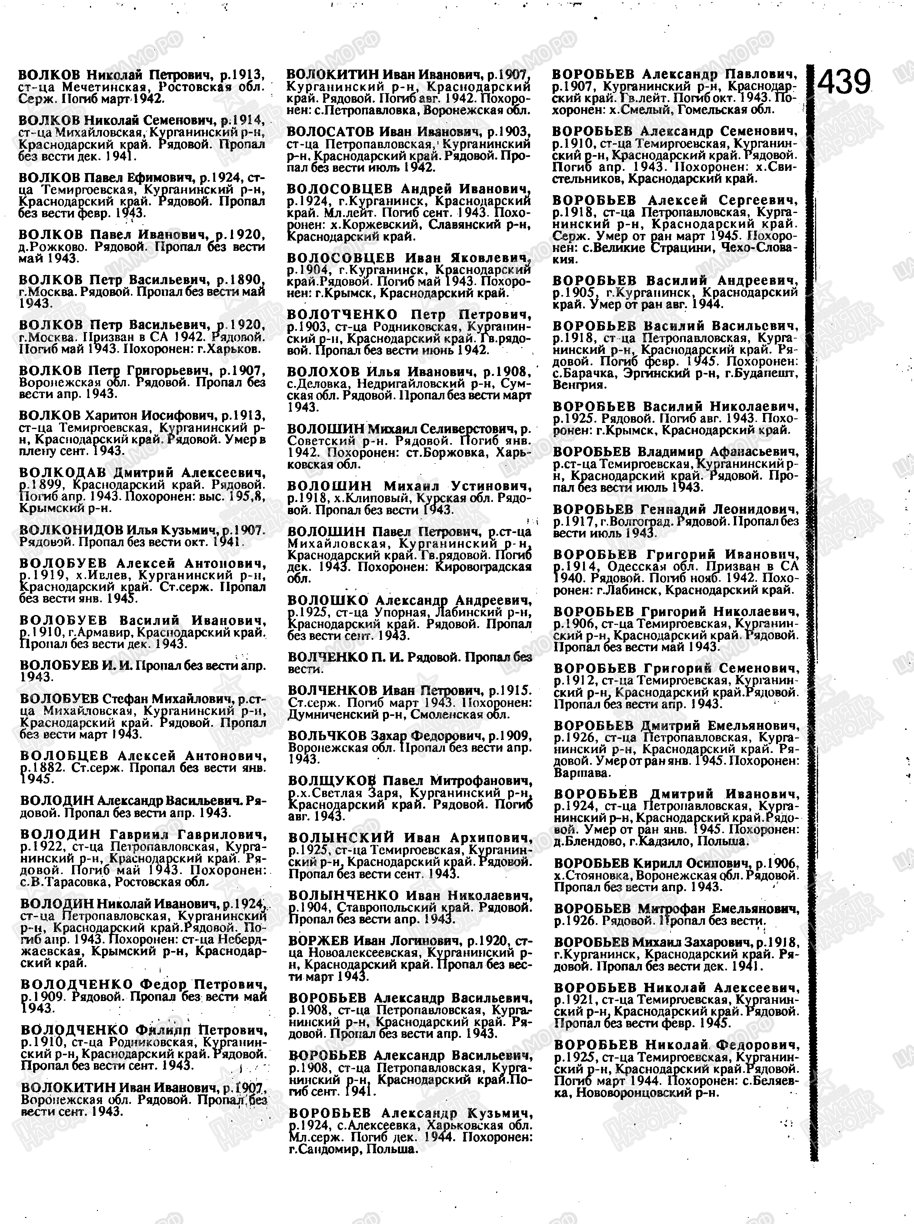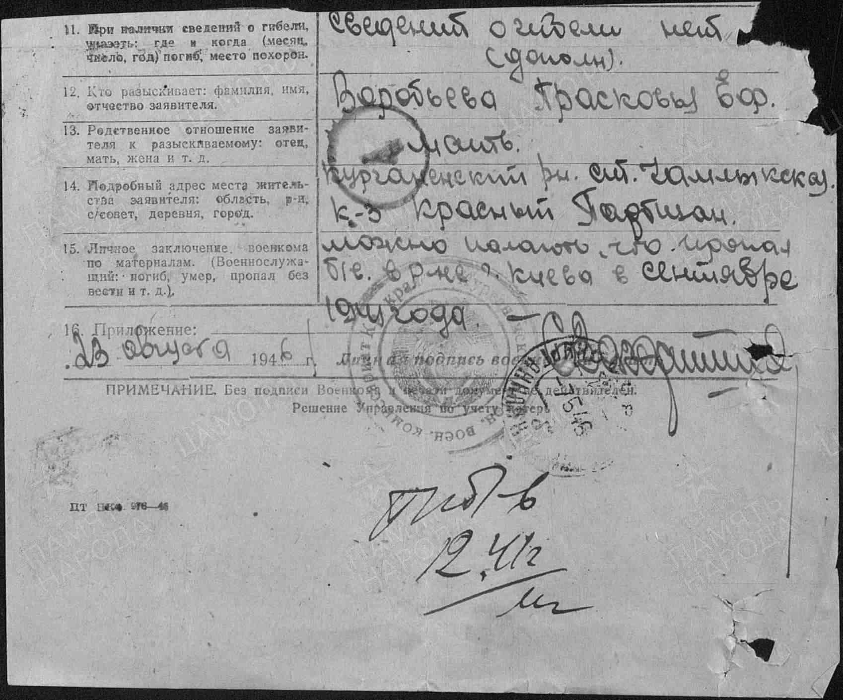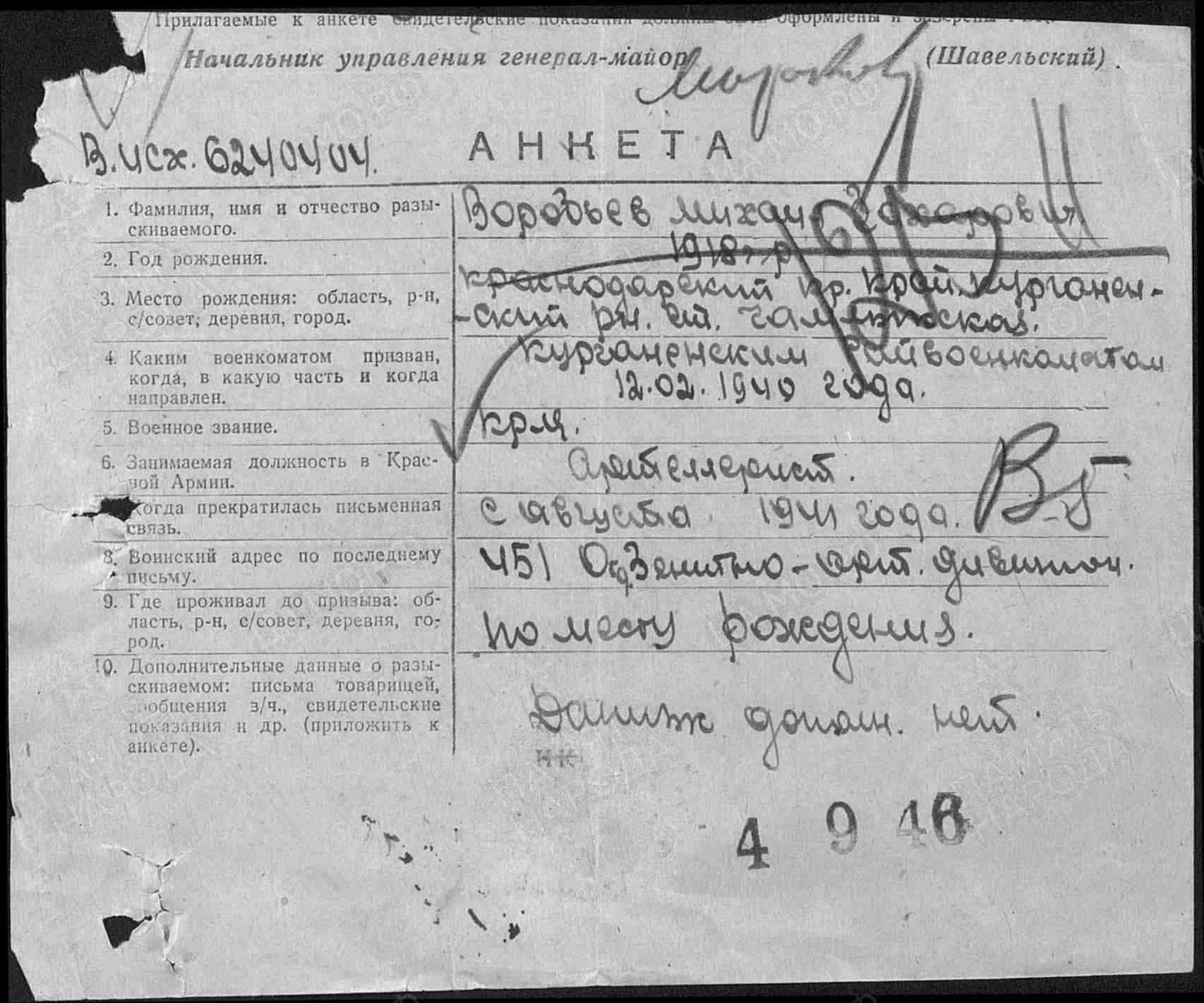 Воробьев М.З. родился в ст.Чамлыкской в 1918 г. В РККА с 1940 года. Воевал в составе 451 отдельного зенитного артиллерийского дивизиона 2 Белорусского фронта. Пропал без вести в декабре 1941 года.