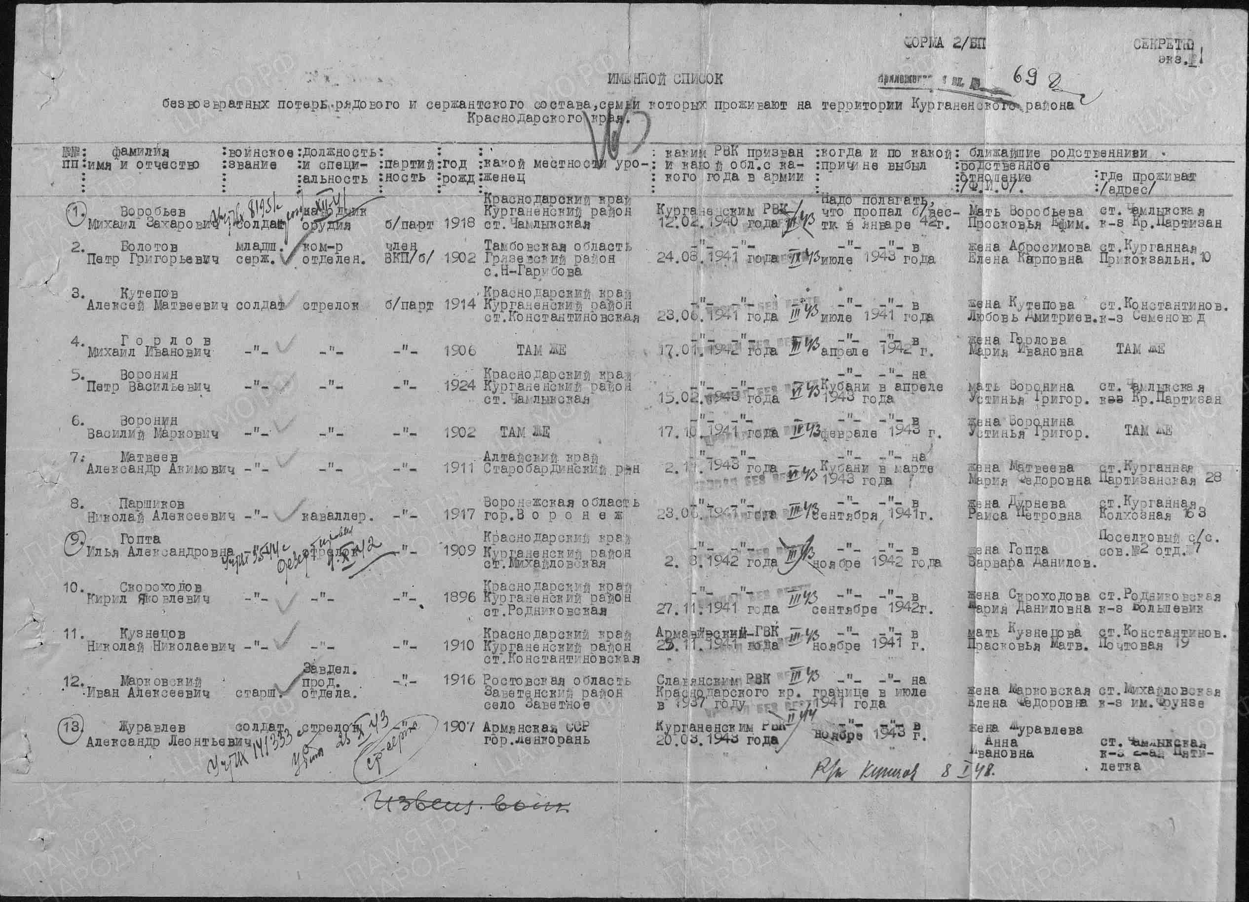Воронин П.В. родился в станице Чамлыкской в 1924 г. На фронт призван в феврале 1943 г. Пропал без вести в июне 1943 г.