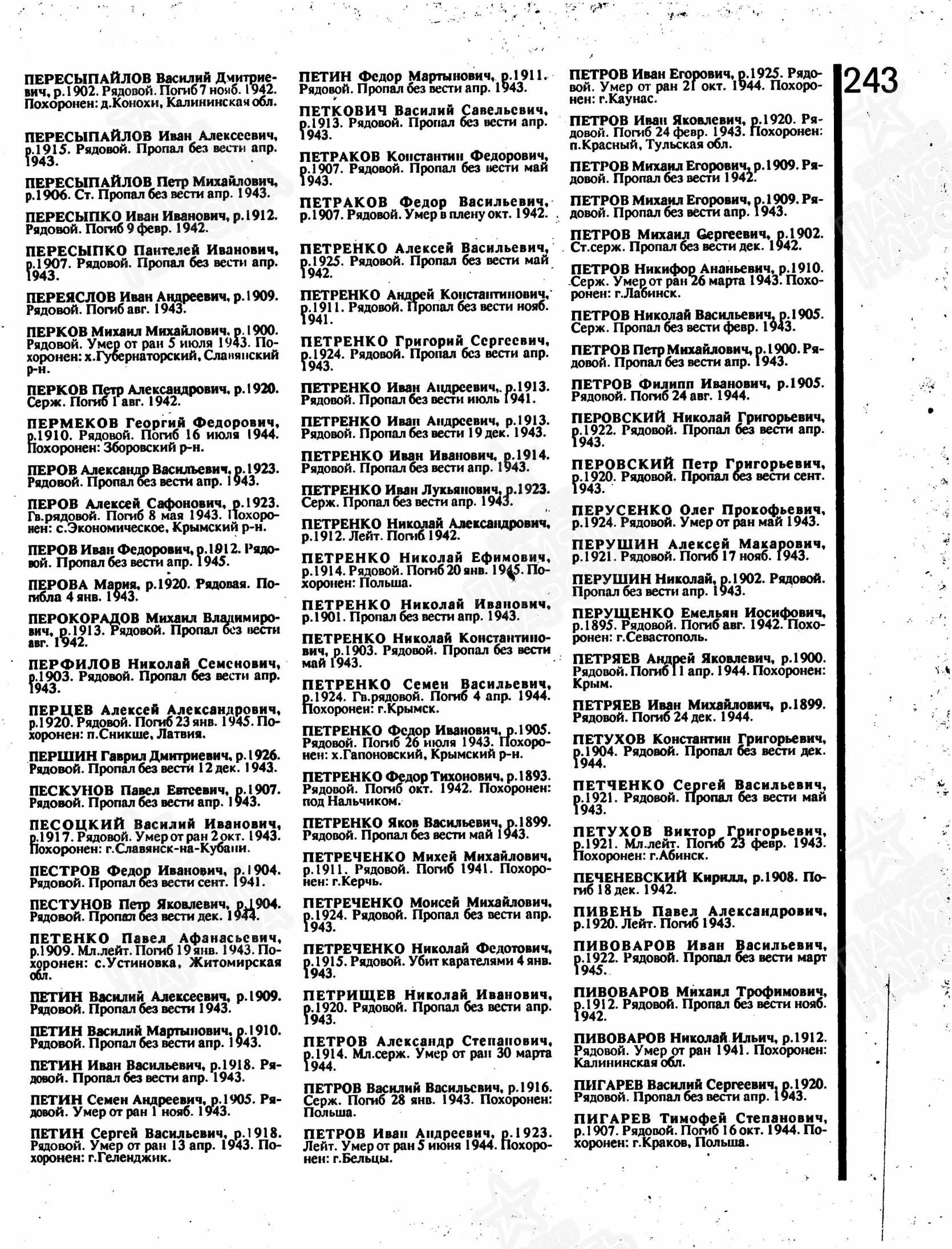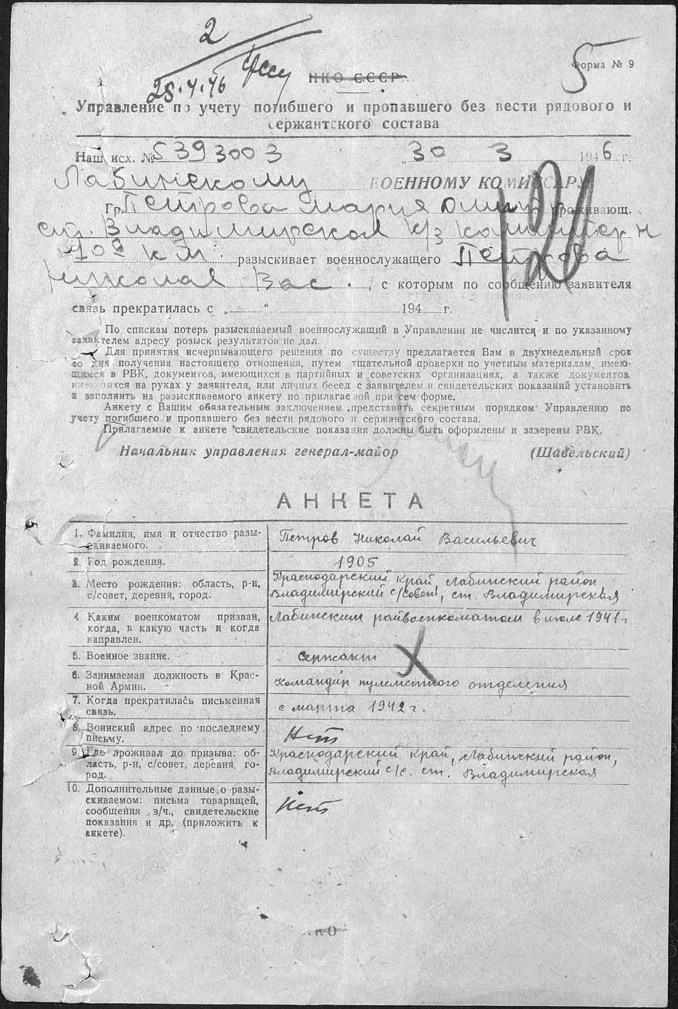 Петров Николай Васильевич родился в 1905 году Краснодарский край, Лабинский р-н, ст. Владимирская. В ряды Красной Армии призывался Лабинским РВК, Краснодарский край, Лабинский район в июле 1941 года. Воинское звание: сержант. Должность: командир пулеметного отделения. Николай Васильевич считается пропавшим без вести с февраля 1943 года.