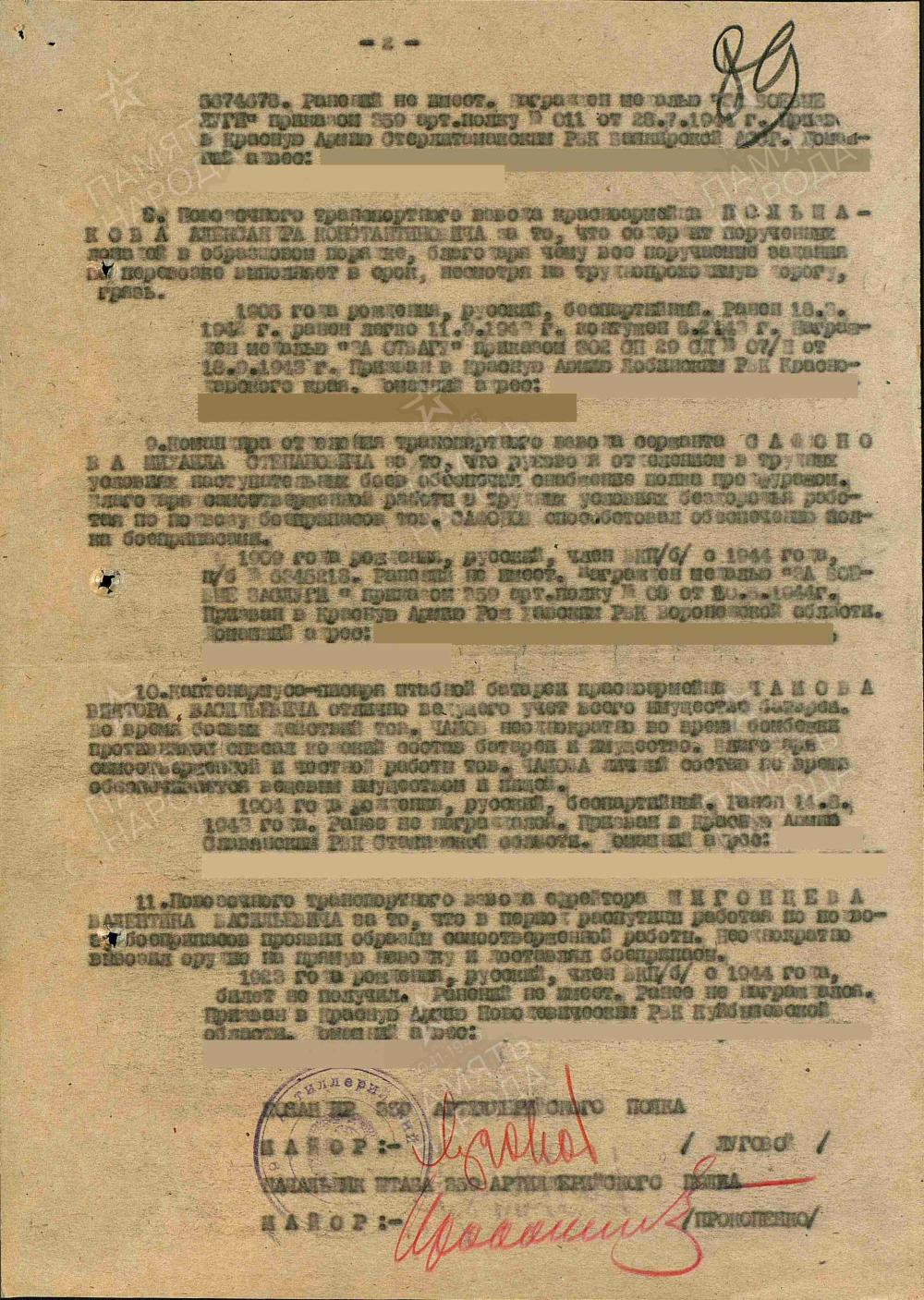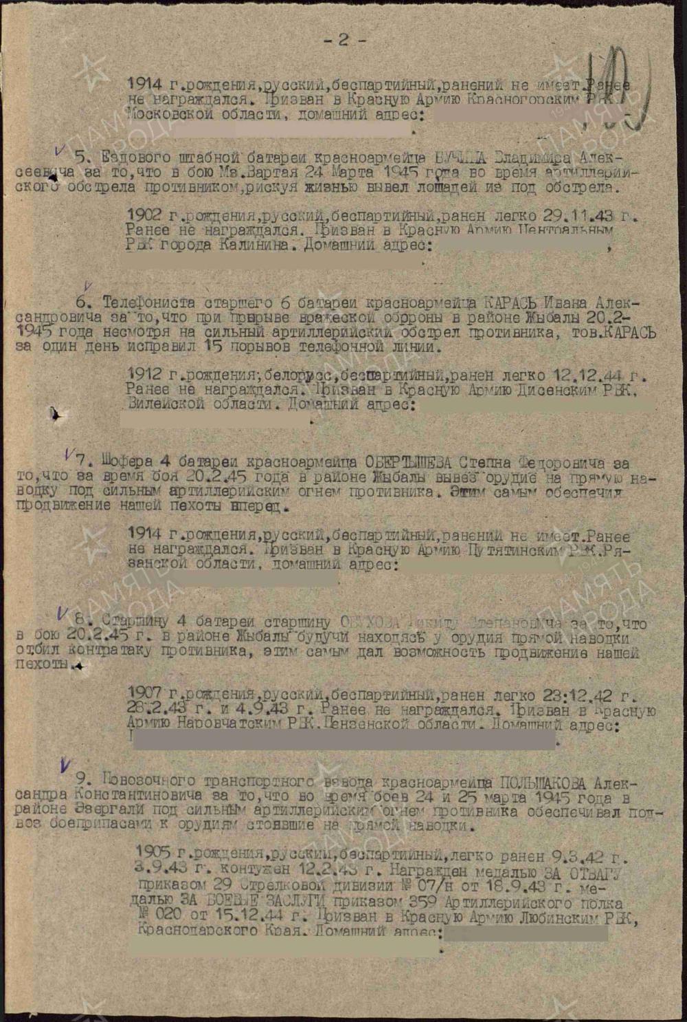 Польшаков Александр Константинович родился в 1905 году Краснодарский край, Лабинский р-н, ст. Владимировская. В ряды Красной Армии призывался Лабинским РВК, Краснодарский край, Лабинский район. Воинское звание: красноармеец, повозчик транспортного взвода. Воевал в составе 359 артиллерийский полк 166 стрелковой дивизии 359 артиллерийский полк 302 стрелковый полк. Был награжден Медалью «За боевые заслуги» (2) Медалью «За отвагу» (2). Александр Константинович был легко ранен 9 марта 1942 года и 3 сентября 1943 года. Контузию получил 12 февраля 1943 года.