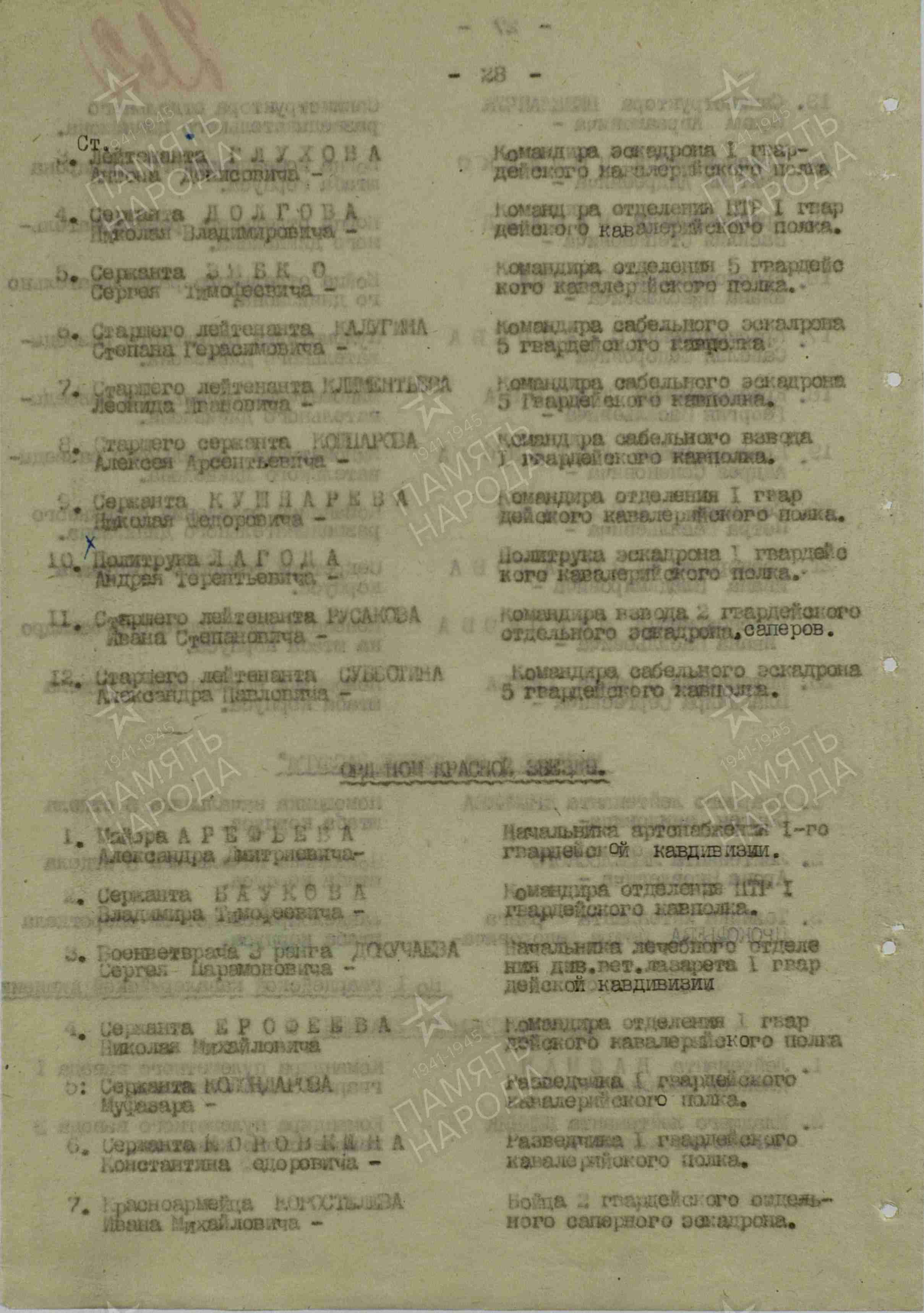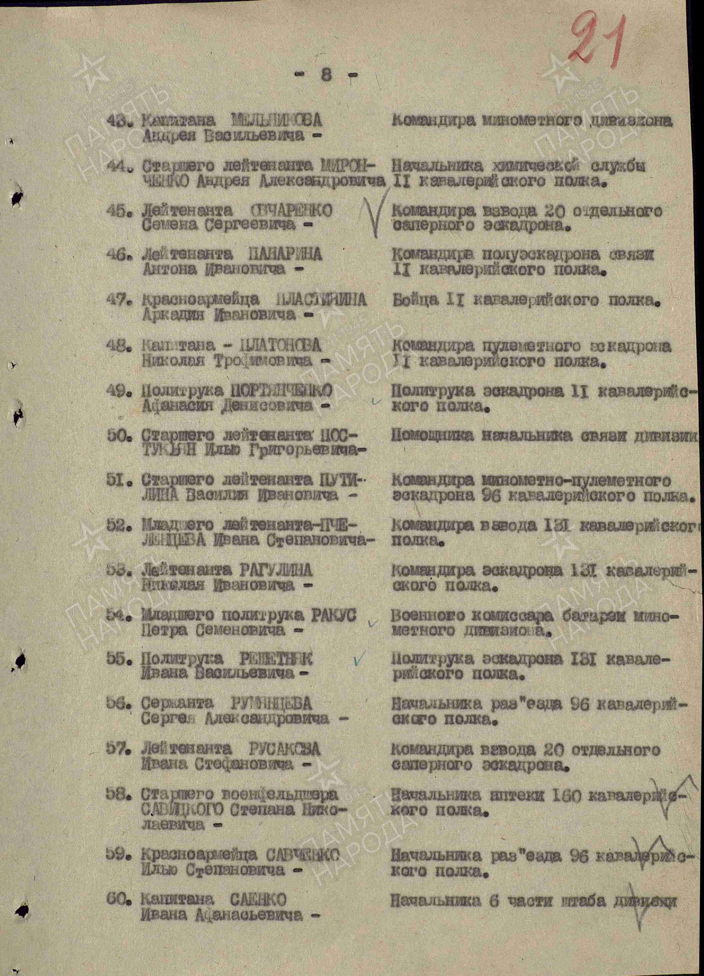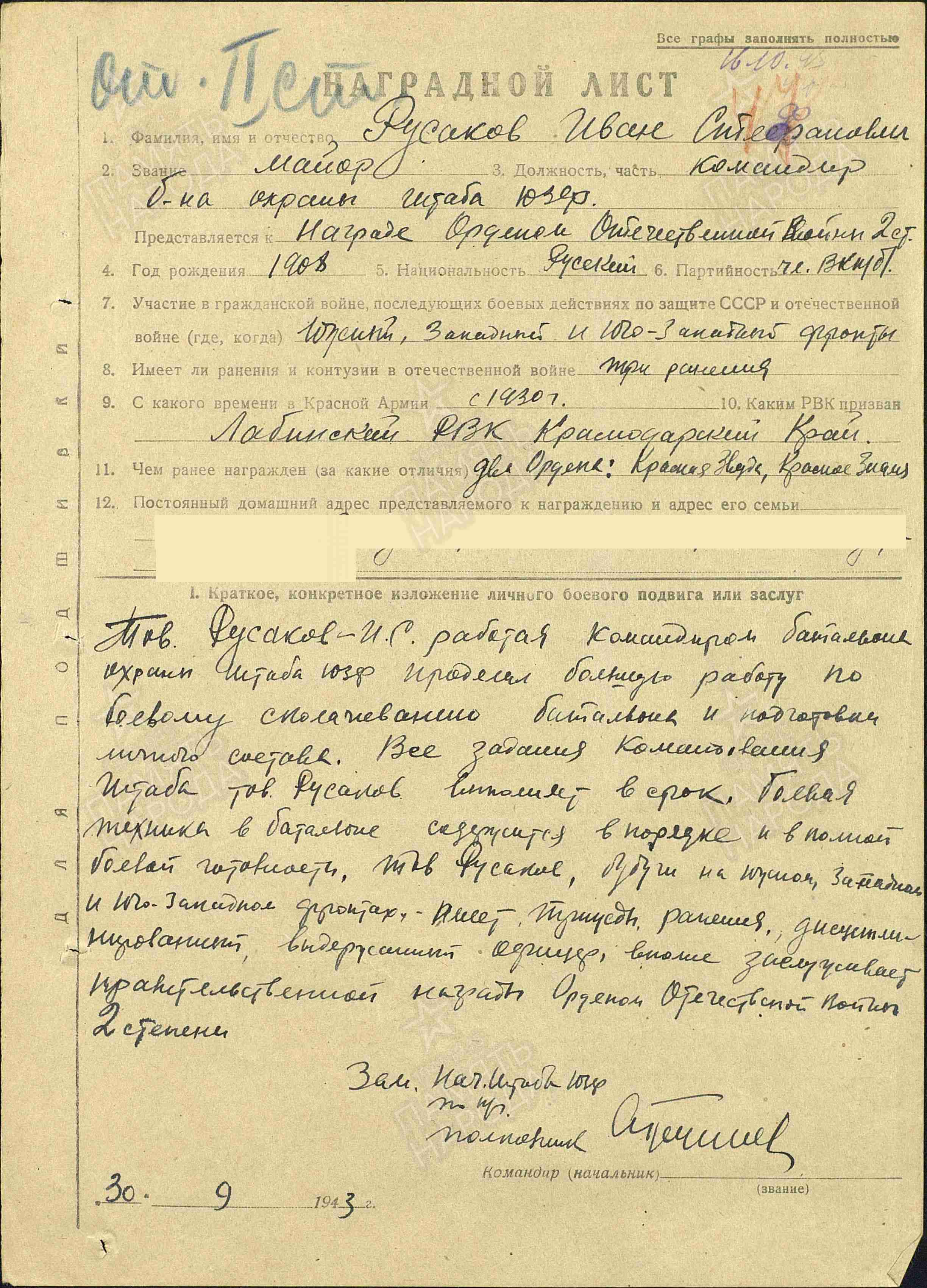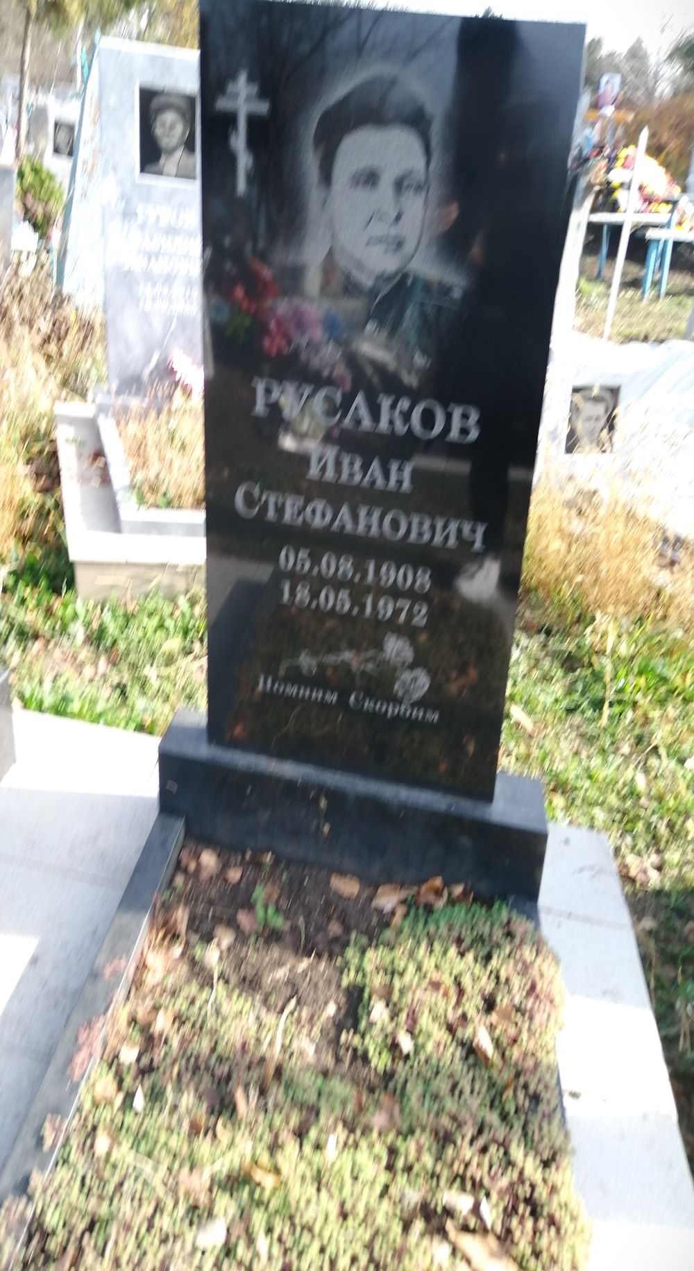 Русаков Иван Степанович(Стефанович) родился 5 июня (июля) 1908 года Краснодарский край, Лабинский р-н, ст. Владимировская. В ряды Красной Армии призывался 11 октября (ноября) 1930 года Лабинским РВК, Краснодарский край, Лабинский район. Воинское звание: гв. ст. лейтенант ; лейтенант ; майор, гв. майор ; инженер-майор. Был командиром взвода 20-го отдельного саперного эскадрона, командир батальона охраны штаба ЮЗЕР. Получил три ранения. Воевал в 1 гвардейской кавалерийской дивизии Юго-Западный фронт Западный фронт.61 армия 2 кавалерийский корпус 5 кавалерийская дивизия. Был награжден орденами и медалями: Орден Красного Знамени (2) Орден Красной Звезды (2) Орден Отечественной войны II степени (2) Медаль «За боевые заслуги» Медаль «За оборону Москвы» Медаль «За победу над Германией в Великой Отечественной войне 1941–1945 гг.». После мобилизации 26 февраля 1946 года вернулся в родную станицу. Умер Иван Степанович 18 мая 1972 года.