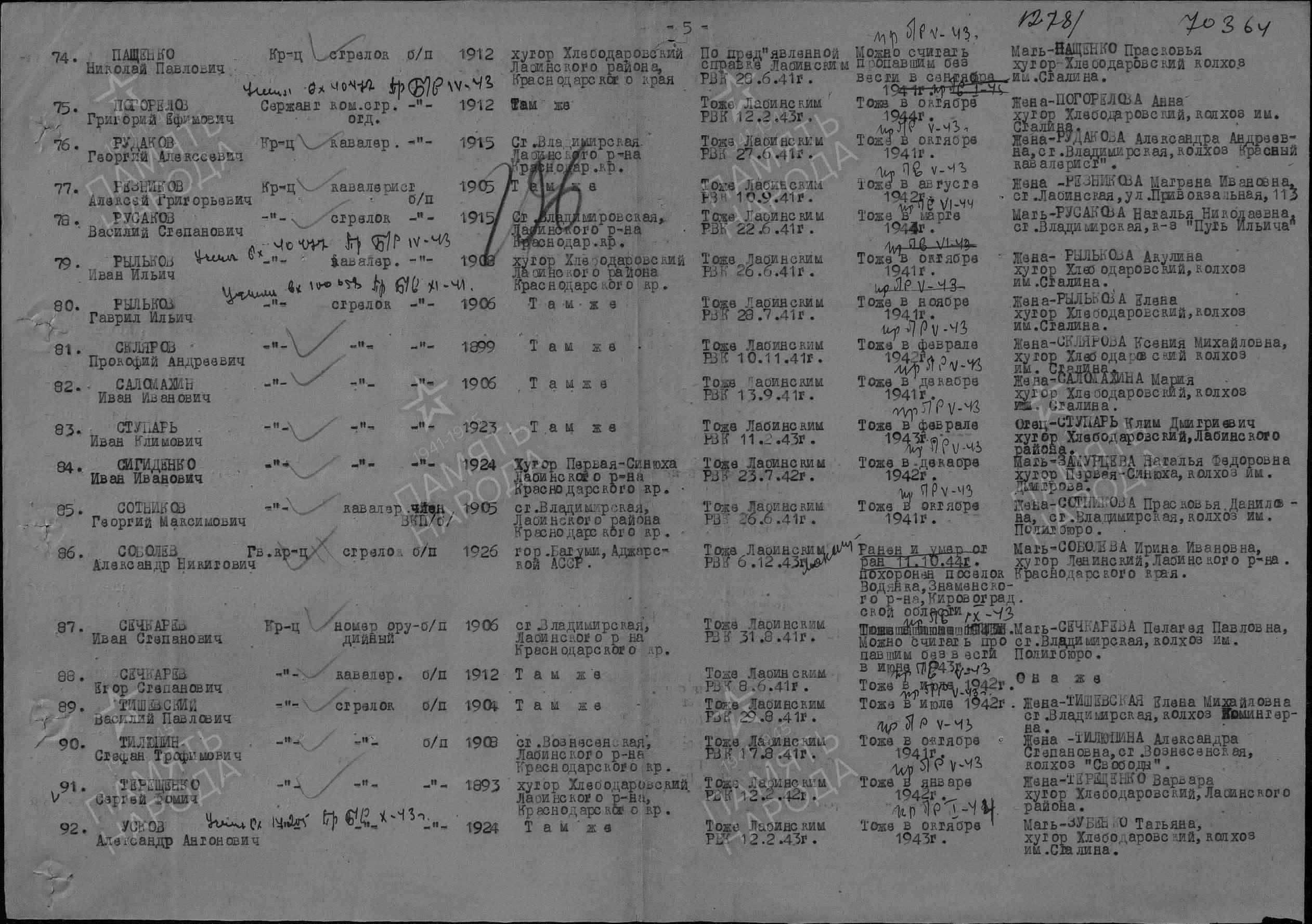 Русаков Василий Степанович родился в 1915 году Краснодарский край, Лабинский р-н, ст. Владимирская. В ряды Красной Армии призывался 22 июня 1941 года Лабинским РВК, Краснодарский край, Лабинский район. Воинское звание: красноармеец, стрелок. Василий Степанович считается пропавшим без вести с июня 1944 года. Дата выбытия: __.06.1944 Причина выбытия: пропал без вести
