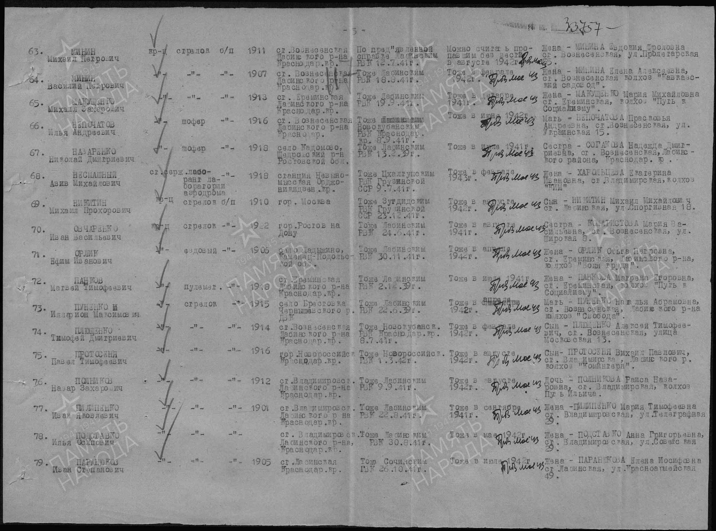 Полников Назар Захарович родился в 1912 году Краснодарский край, Лабинский р-н, ст. Владимировская. В ряды Красной Армии призывался 9 сентября 1941 года Лабинским РВК, Краснодарский край, Лабинский район. Воинское звание: красноармеец, стрелок. Назар Захарович считается пропавшим без вести с мая 1943 года.