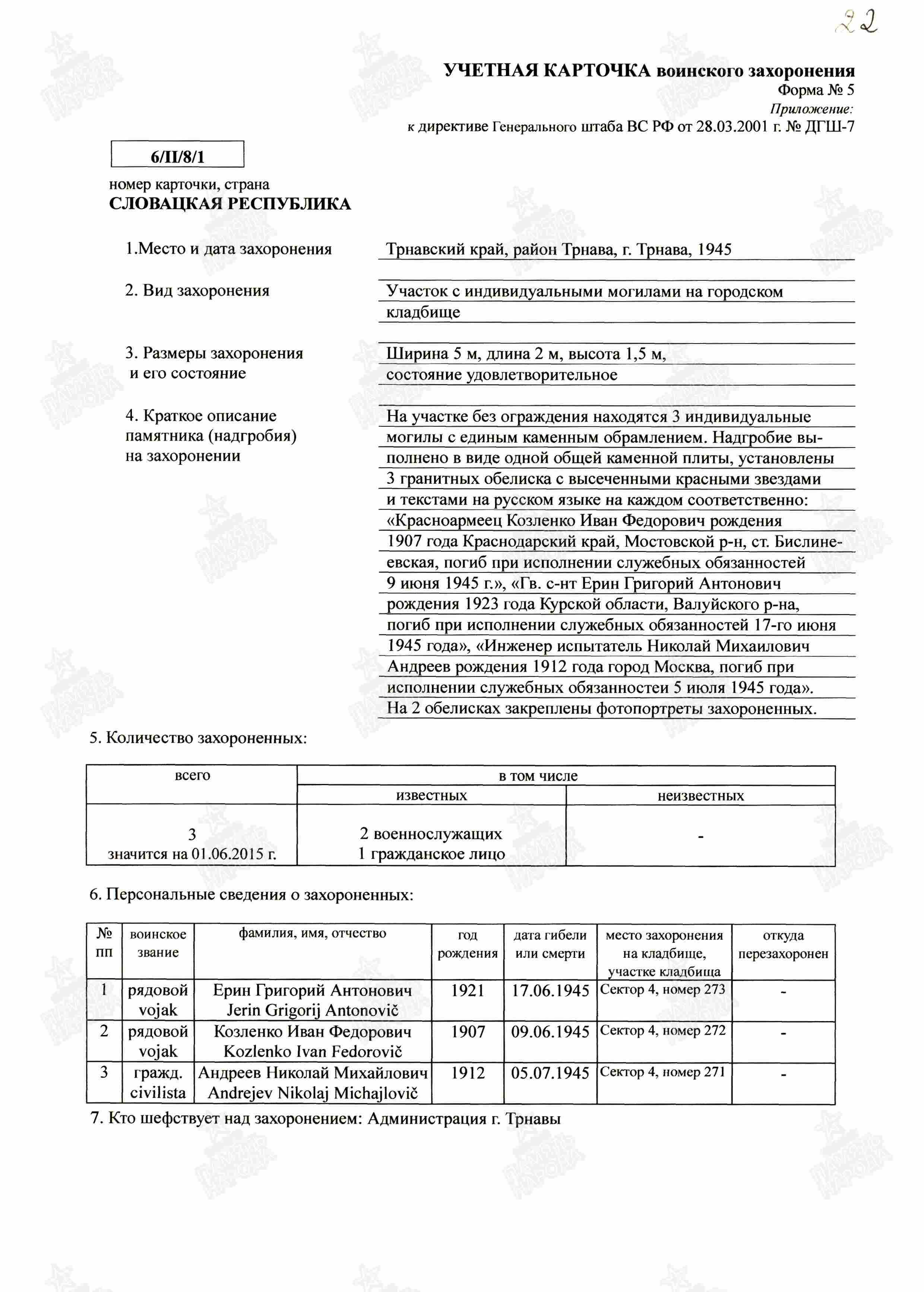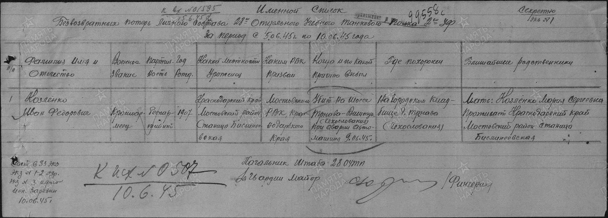 Козленко Иван Федорович родился в 1907году Краснодарский край, Лабинский р-н, ст. Владимирская (Краснодарский край, Мостовский р-н, ст. Беслинеевская).В ряды Красной Армии призывался 23 июня 1941 года Мостовским РВК, Краснодарский край, Мостовский район. Воинское звание: рядовой ; красноармеец. Воевал в составе: 28 отдельный учебный танковый полк 2 Украинского фронт в 447 отдельный автотранспортный батальон 180 армейский запасной стрелковый полк 46 запасной стрелковый полк 15 запасной стрелковой бригады 773 артиллерийский полк 1137 стрелковый полк 339 стрелковой дивизии. Убит 9 июня 1945 года. Место захоронения: район Трнав, г. Трнава ; Чехословакия, Словакия, г. Трнава, кладбище ; Братислава-1 р-н, г. Братислава, Старе Место р-н, ул. На Славине, военно-мемориальный комплекс Славин.