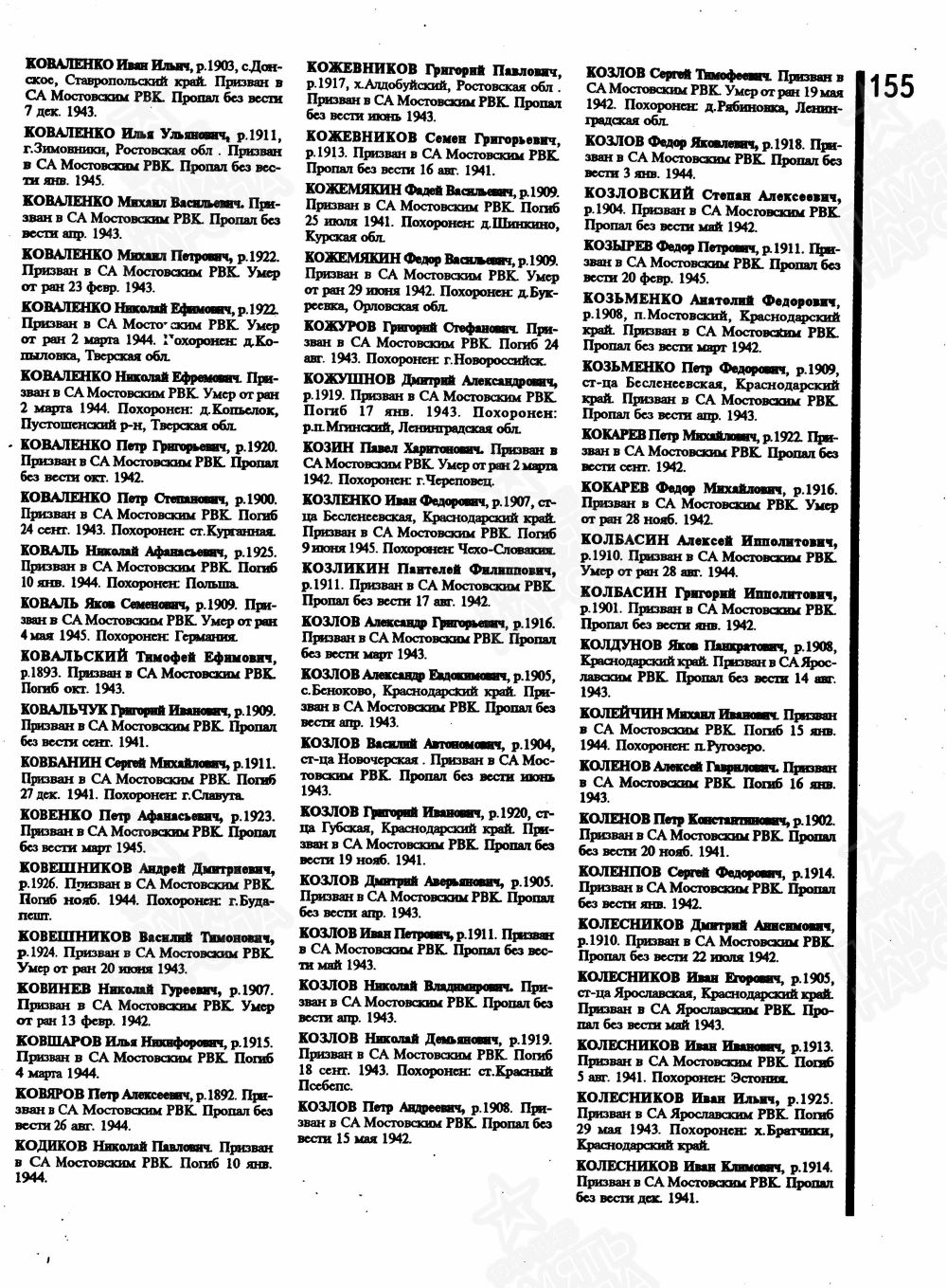 Козленко Иван Федорович родился в 1907году Краснодарский край, Лабинский р-н, ст. Владимирская (Краснодарский край, Мостовский р-н, ст. Беслинеевская).В ряды Красной Армии призывался 23 июня 1941 года Мостовским РВК, Краснодарский край, Мостовский район. Воинское звание: рядовой ; красноармеец. Воевал в составе: 28 отдельный учебный танковый полк 2 Украинского фронт в 447 отдельный автотранспортный батальон 180 армейский запасной стрелковый полк 46 запасной стрелковый полк 15 запасной стрелковой бригады 773 артиллерийский полк 1137 стрелковый полк 339 стрелковой дивизии. Убит 9 июня 1945 года. Место захоронения: район Трнав, г. Трнава ; Чехословакия, Словакия, г. Трнава, кладбище ; Братислава-1 р-н, г. Братислава, Старе Место р-н, ул. На Славине, военно-мемориальный комплекс Славин.